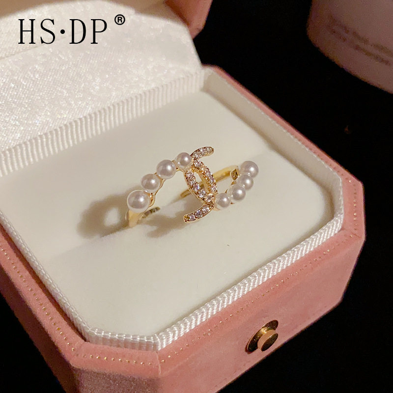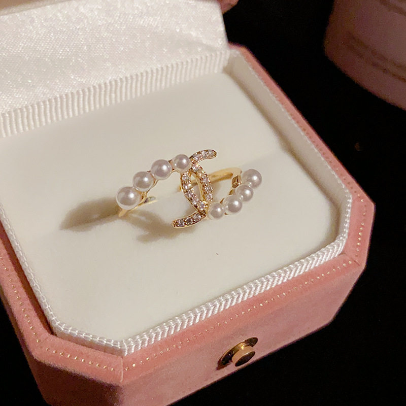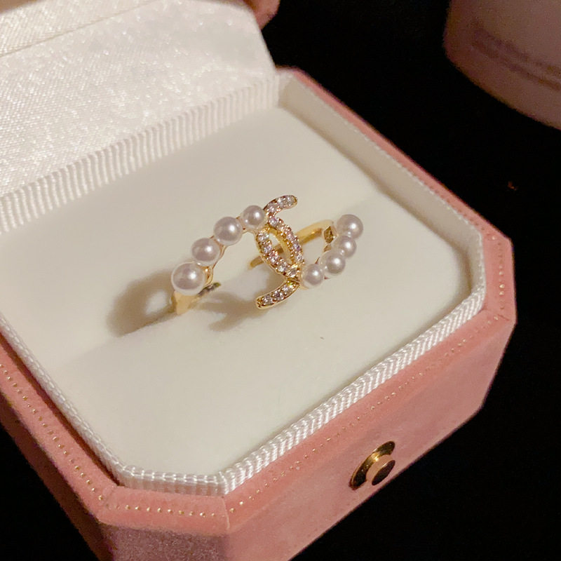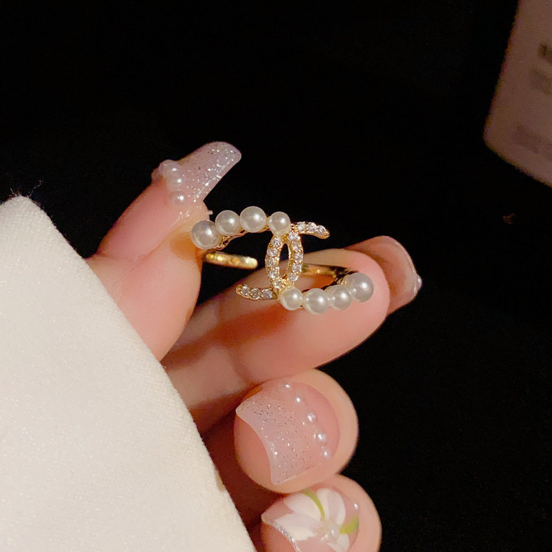 ins小众设计气质小香风珍珠锆石双C戒指高级感时尚个性百搭食指戒