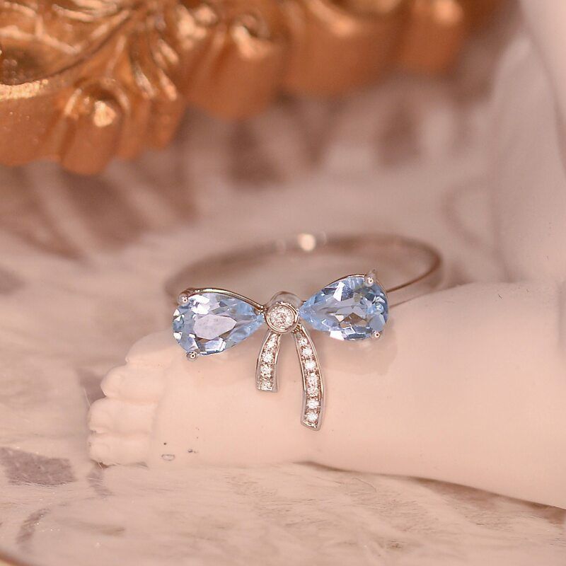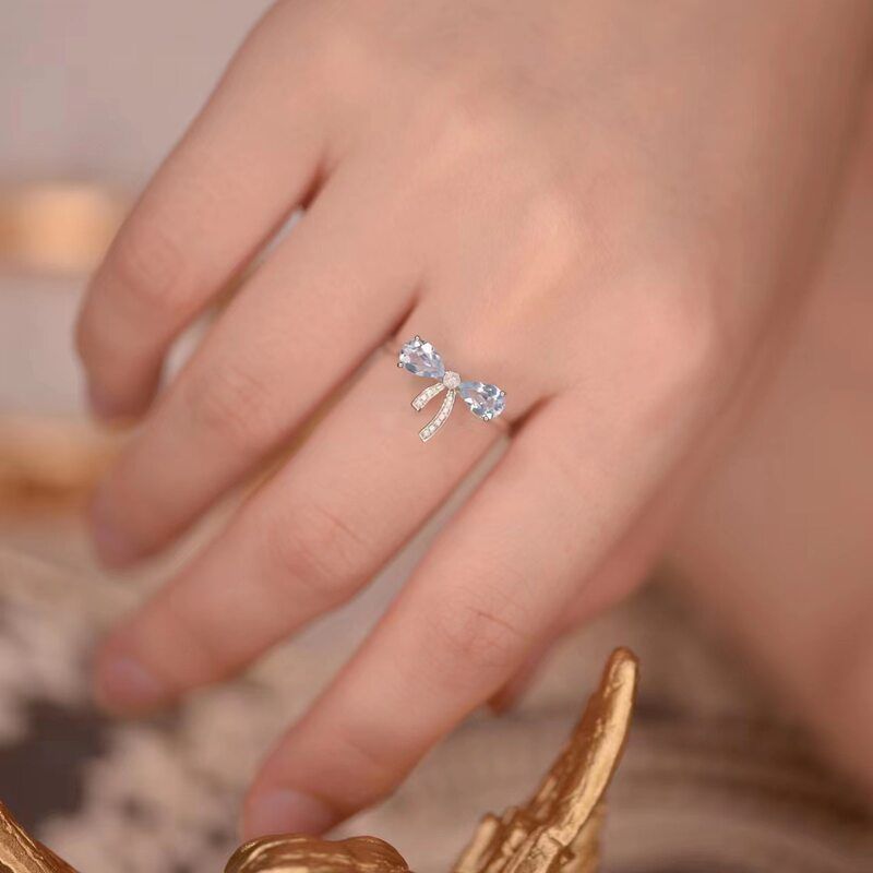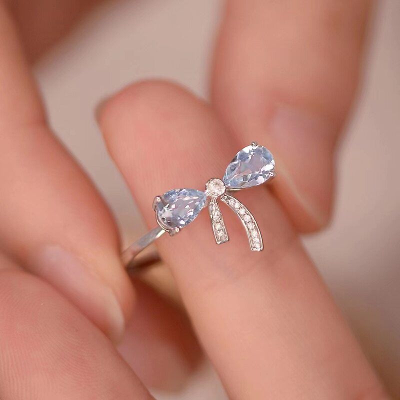 s925纯银新款蓝色锆石蝴蝶结戒指女开口可调节时尚简约个性食指戒