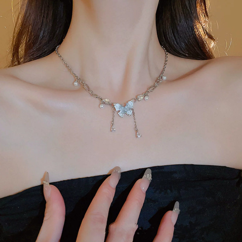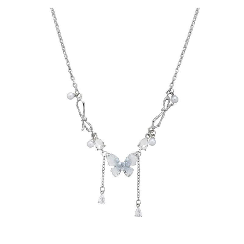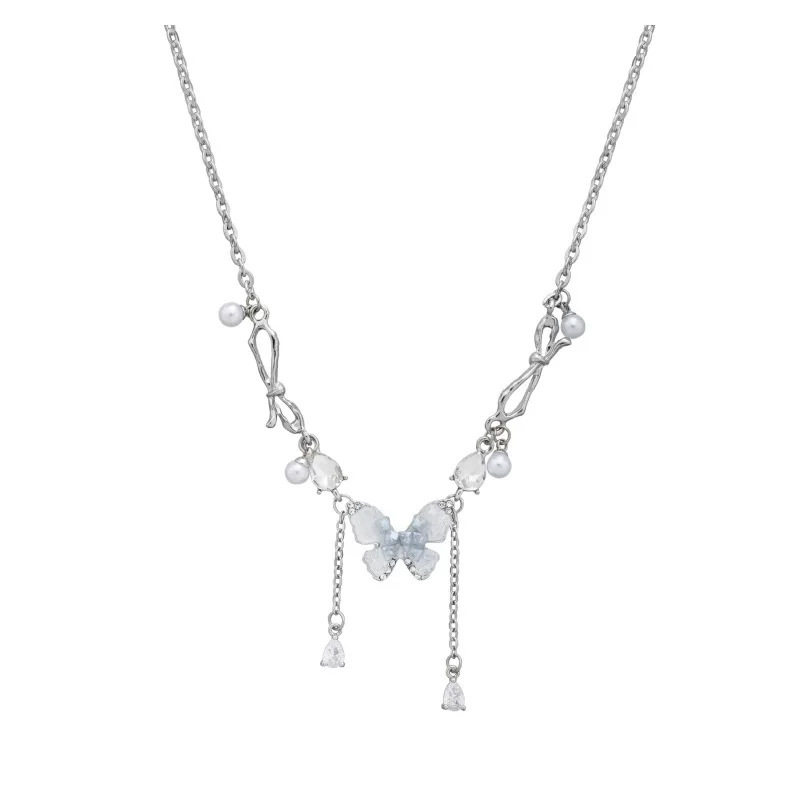 岛屿假日~蓝色蝴蝶双层珍珠项链女清冷感叠戴锁骨链轻奢小众精致