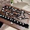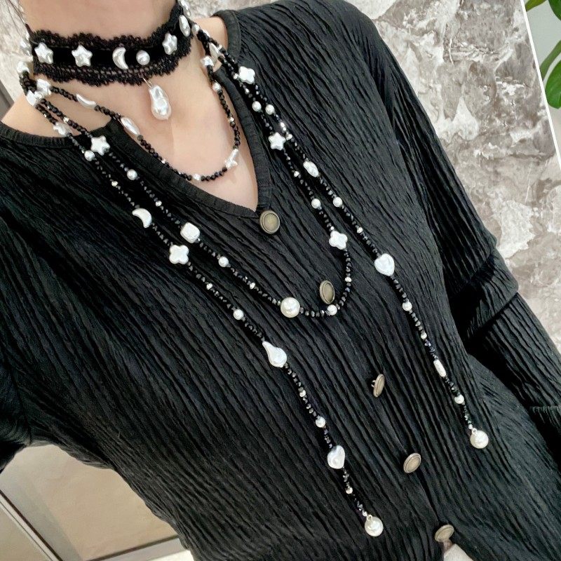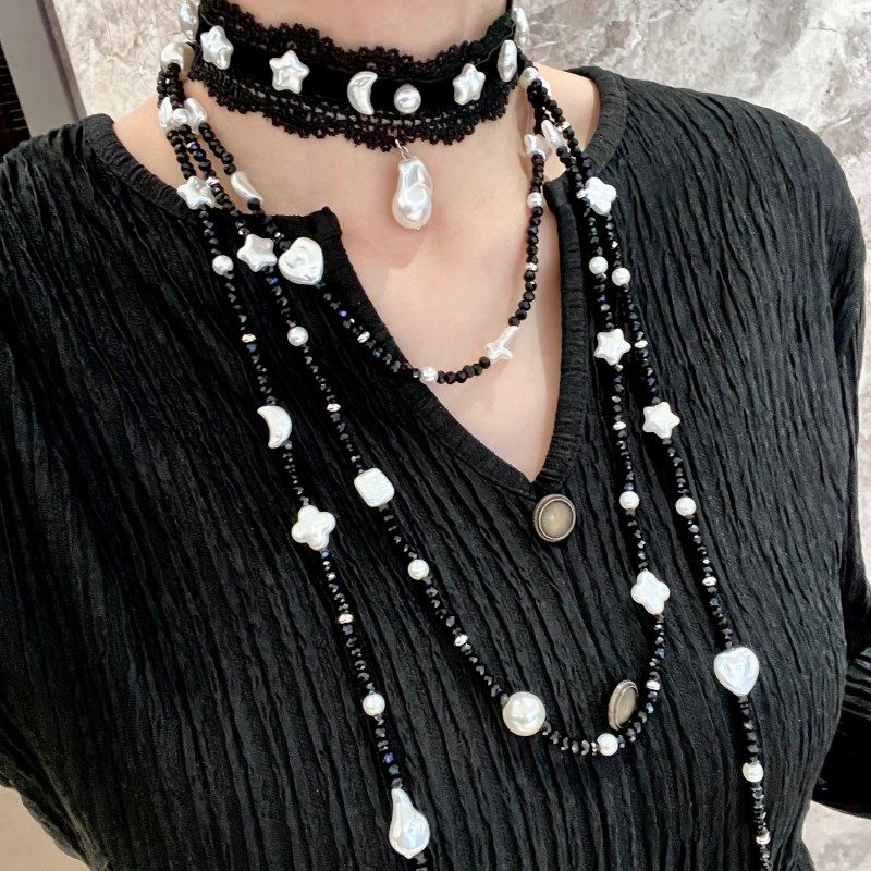 黑色蕾丝珍珠月亮星星颈链choker女长款多层叠戴不规则珍珠毛衣链