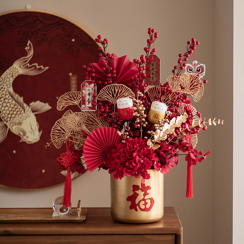 新年金属福桶仿真花发财果花筒春节氛围布置室内客厅桌面装饰摆件