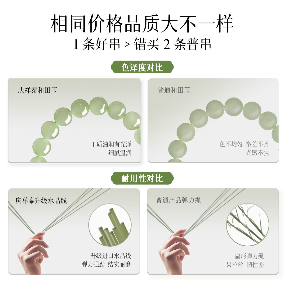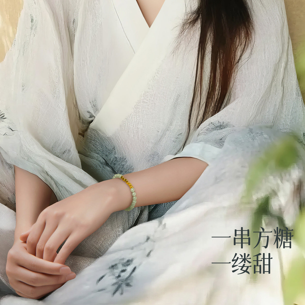 庆祥泰999足金小方糖手链女天然和田玉手串女礼物晴水绿玉石串珠