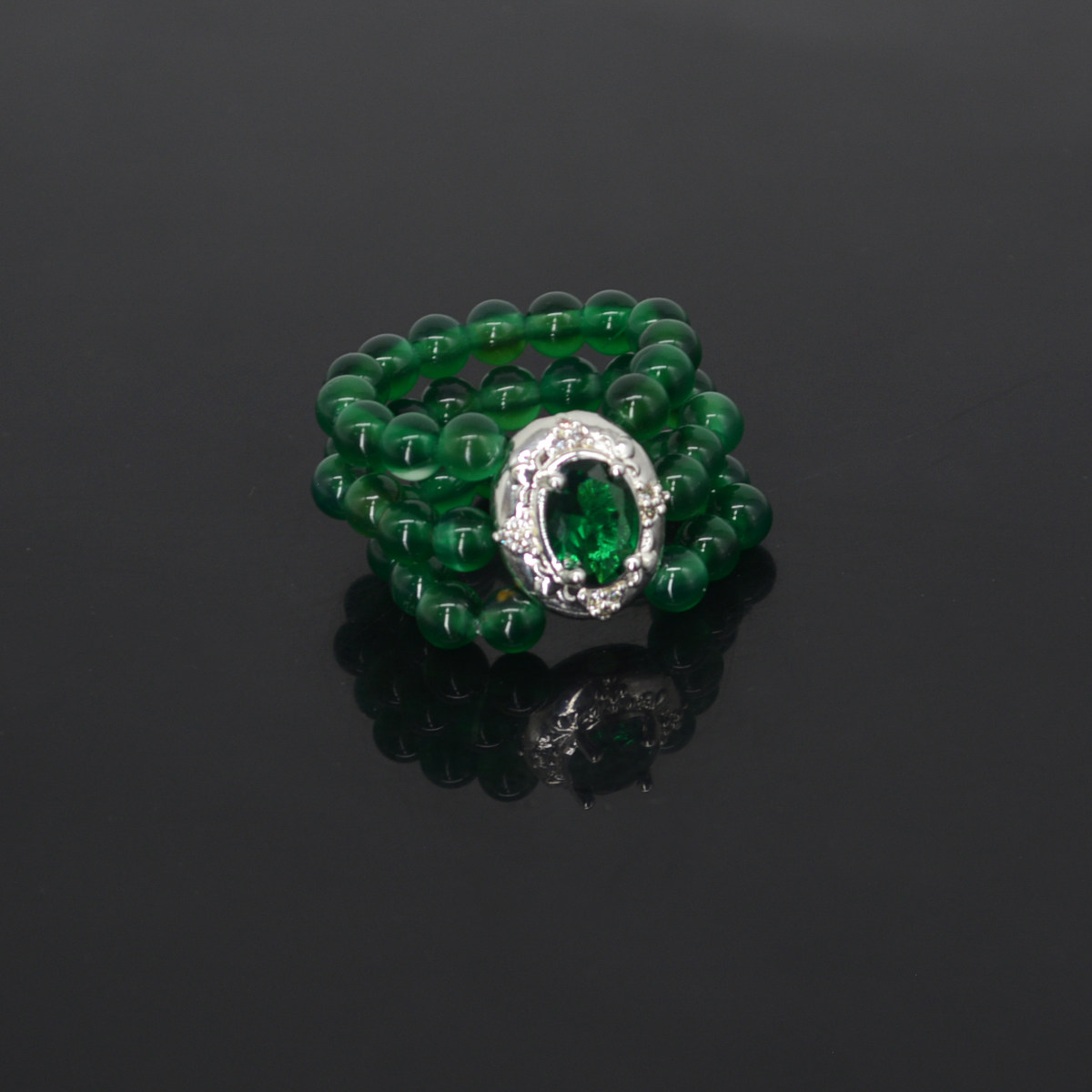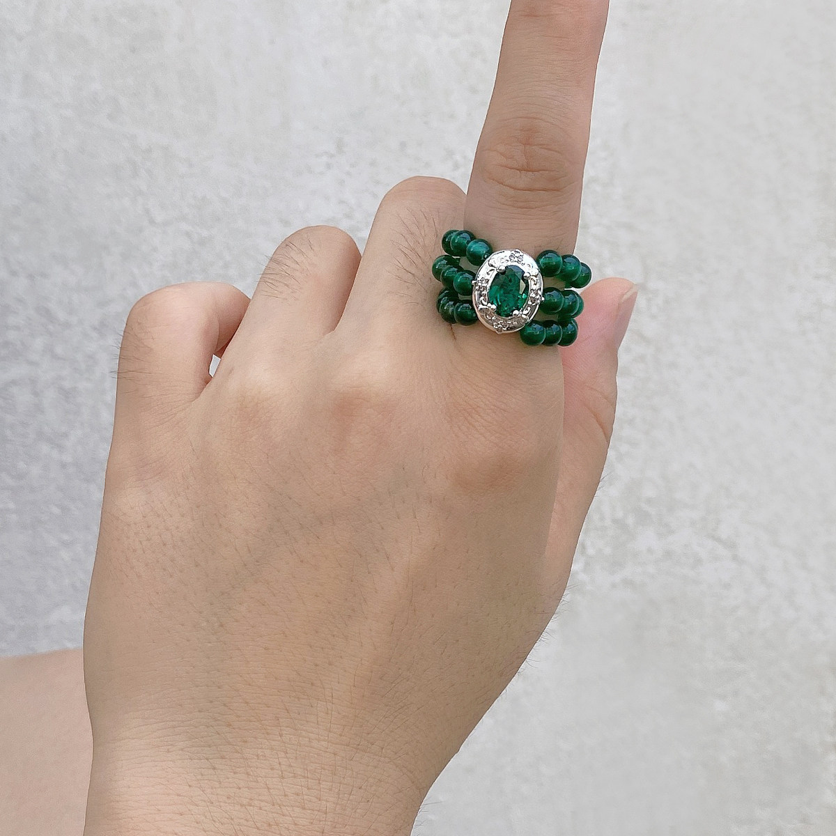 复古奢华镶钻祖母绿宝石戒指女串珠气质个性夸张弹性多层食指指环