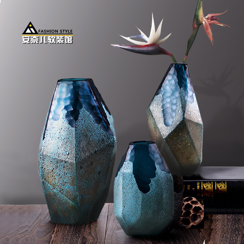 精品咖色刻磨几何玻璃花瓶不规则切面蓝色装饰插花器现代创意摆件