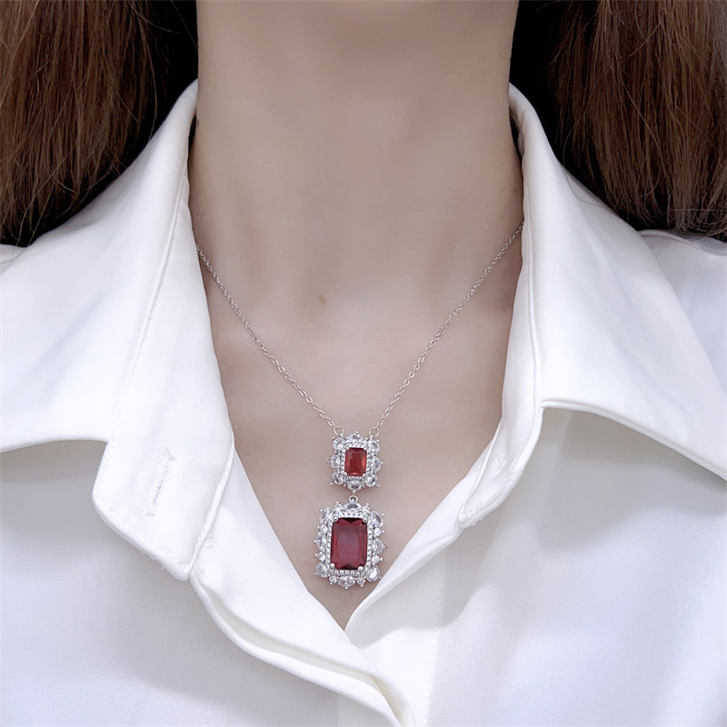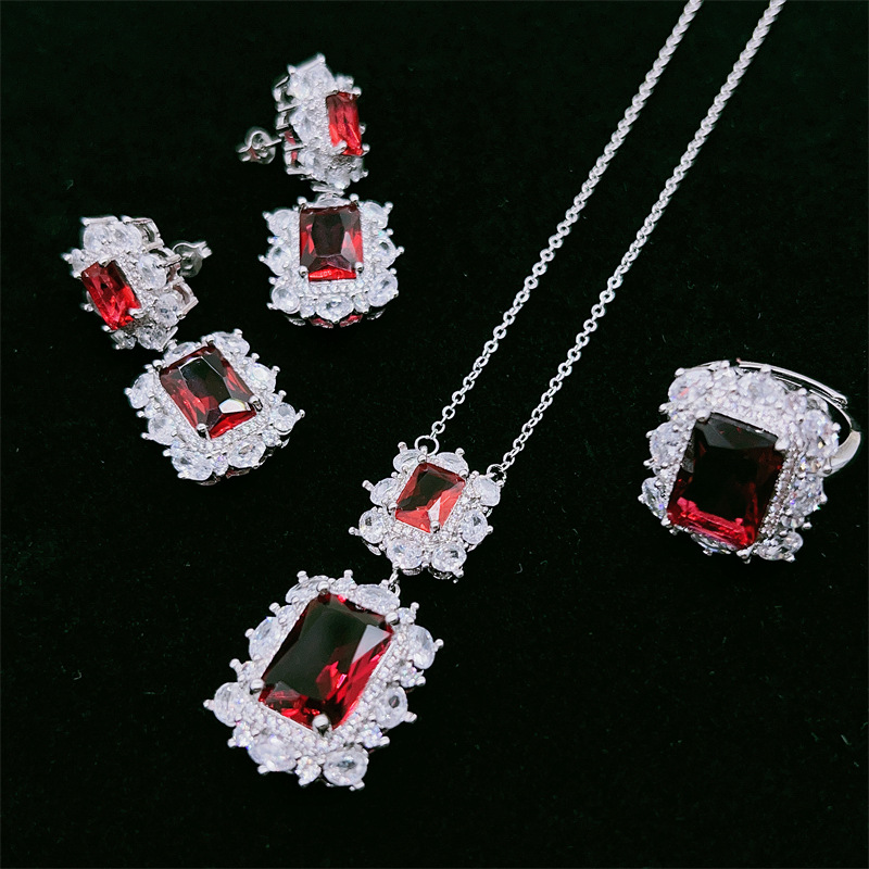 新款欧美气质高级感红钻石戒指耳钉项链女锁骨链奢华鸽血红套装