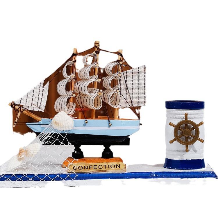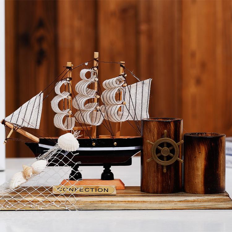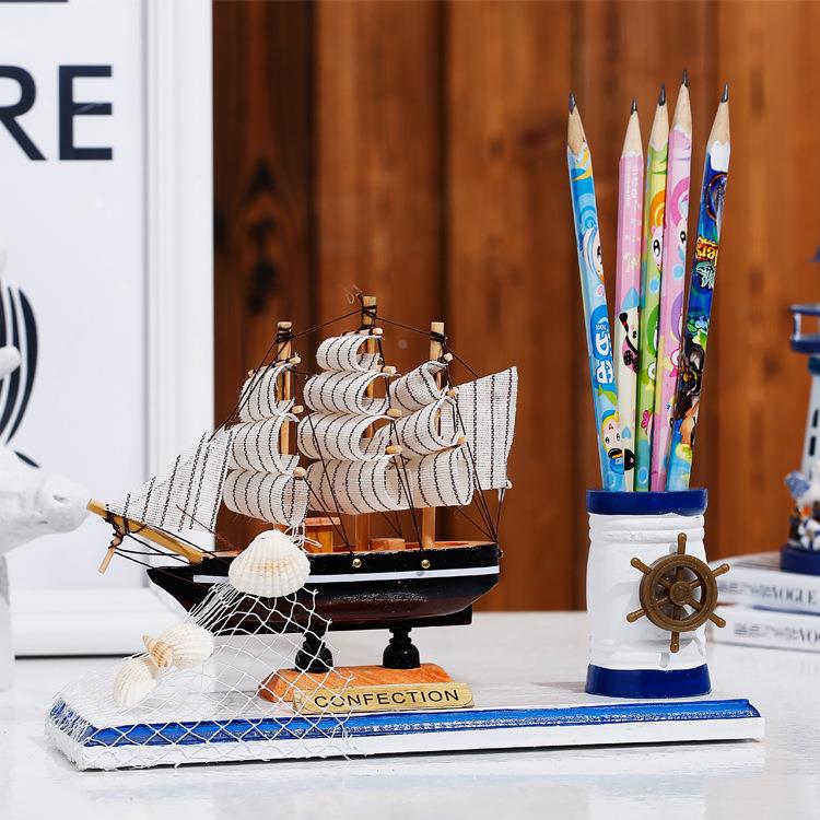 地中海帆船模型笔筒 一帆风顺办公装饰品 创意木质工艺品桌面摆件