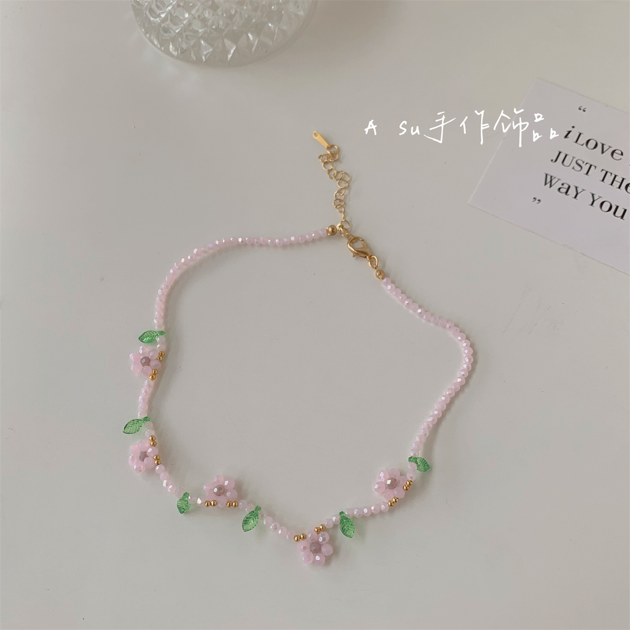 【满25包邮】甜美气质手工编制花朵项链锁骨链夏天圆珠链