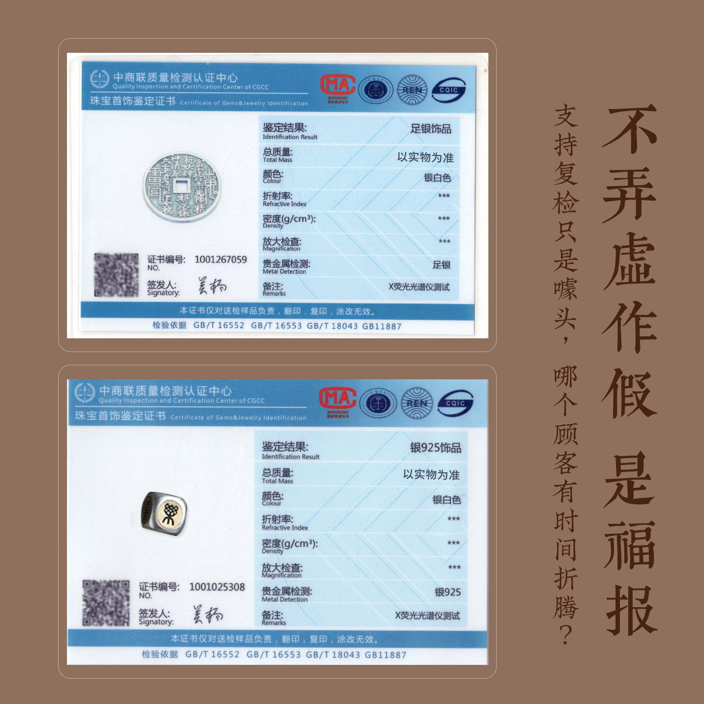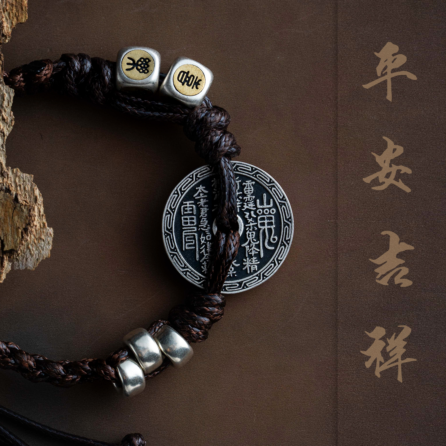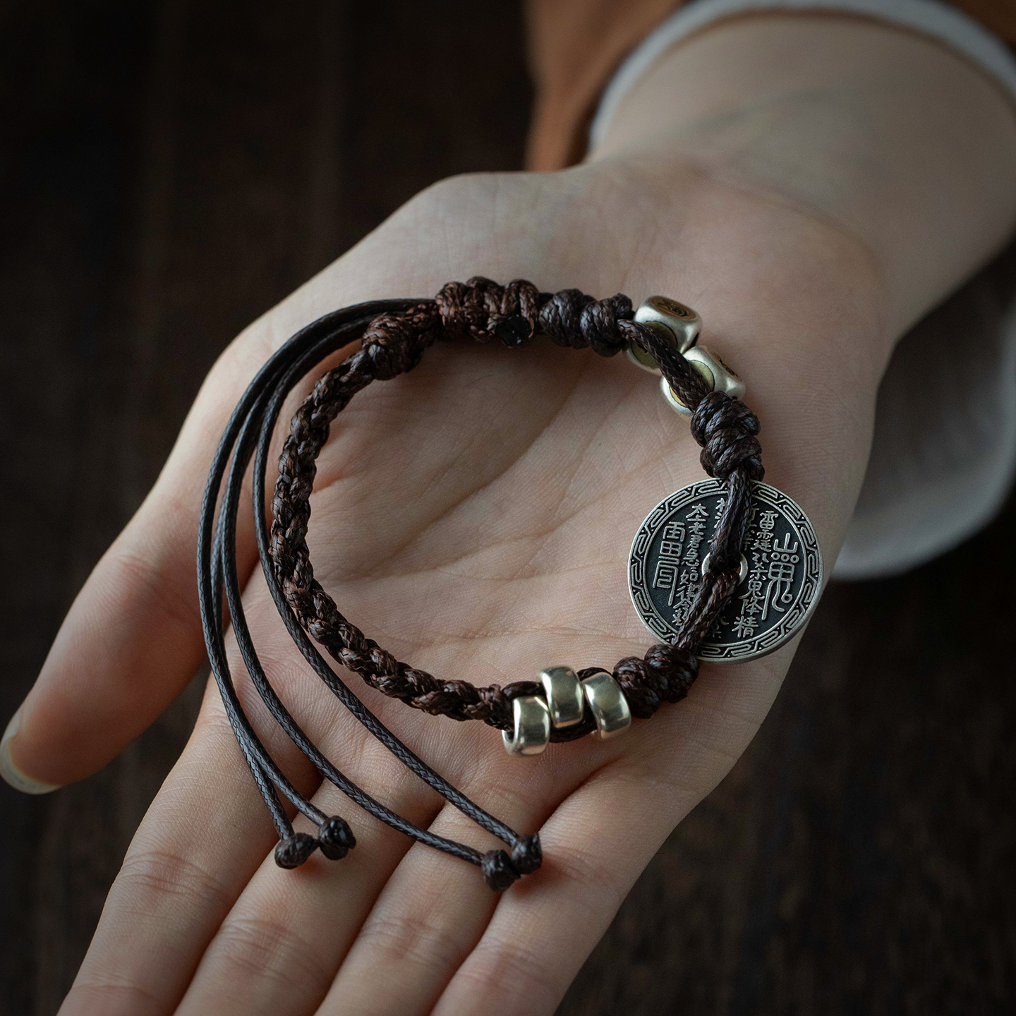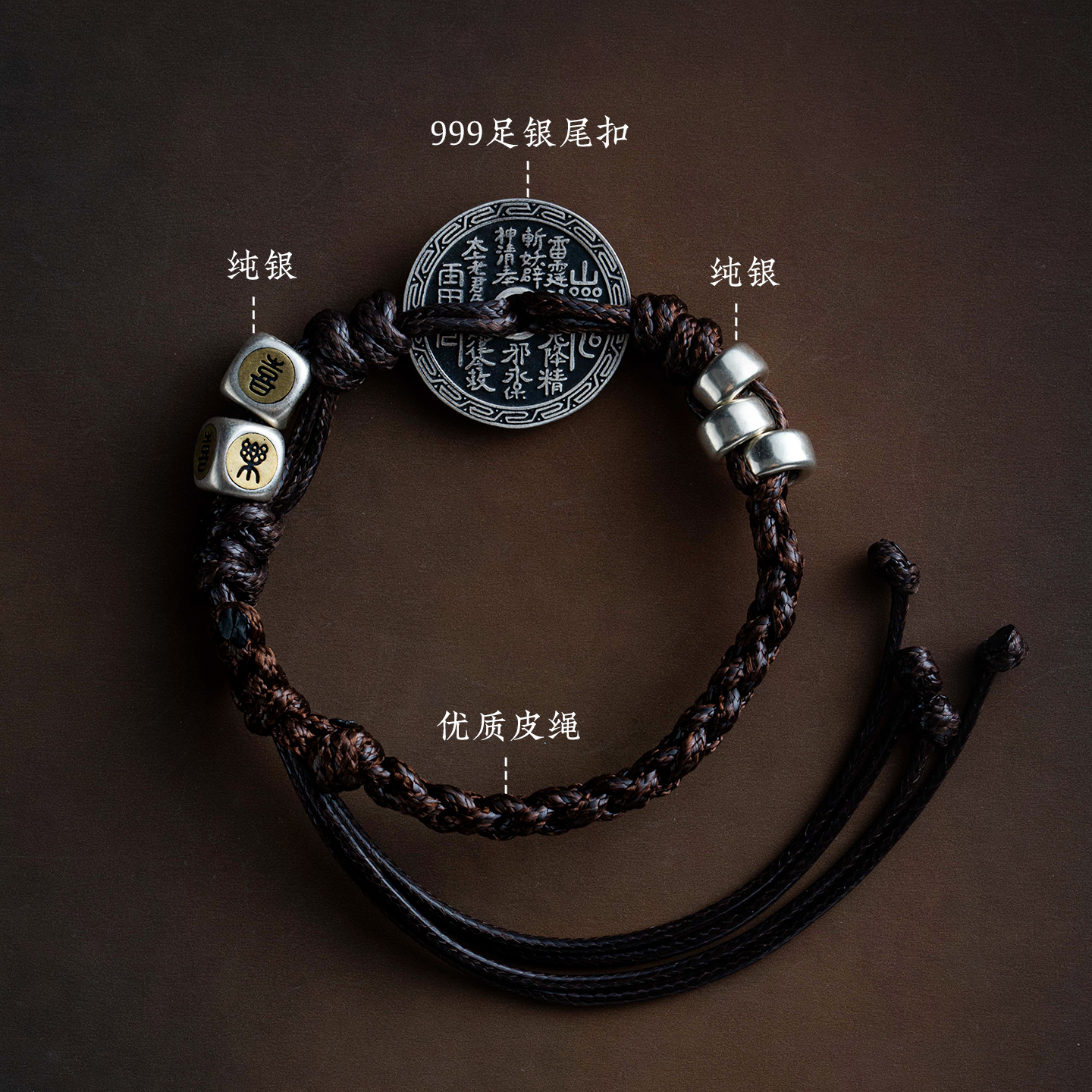 大善堂新款山鬼花钱手绳纯银999足银手饰品简约百搭皮绳手链礼物