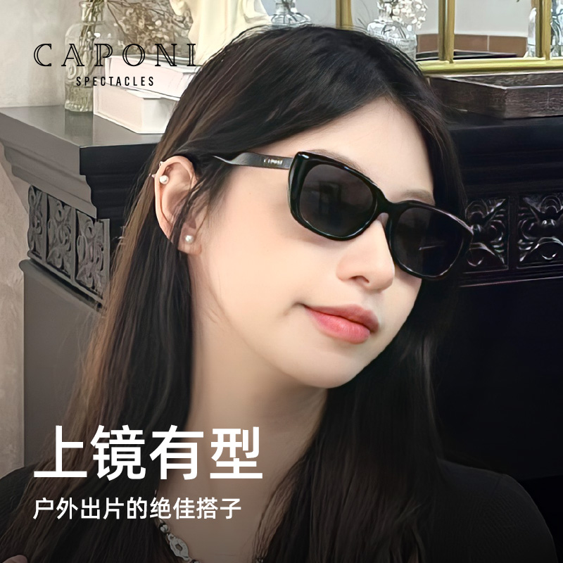 CAPONI小黑框猫眼墨镜女高级感2025新款复古窄框偏光太阳眼镜防晒