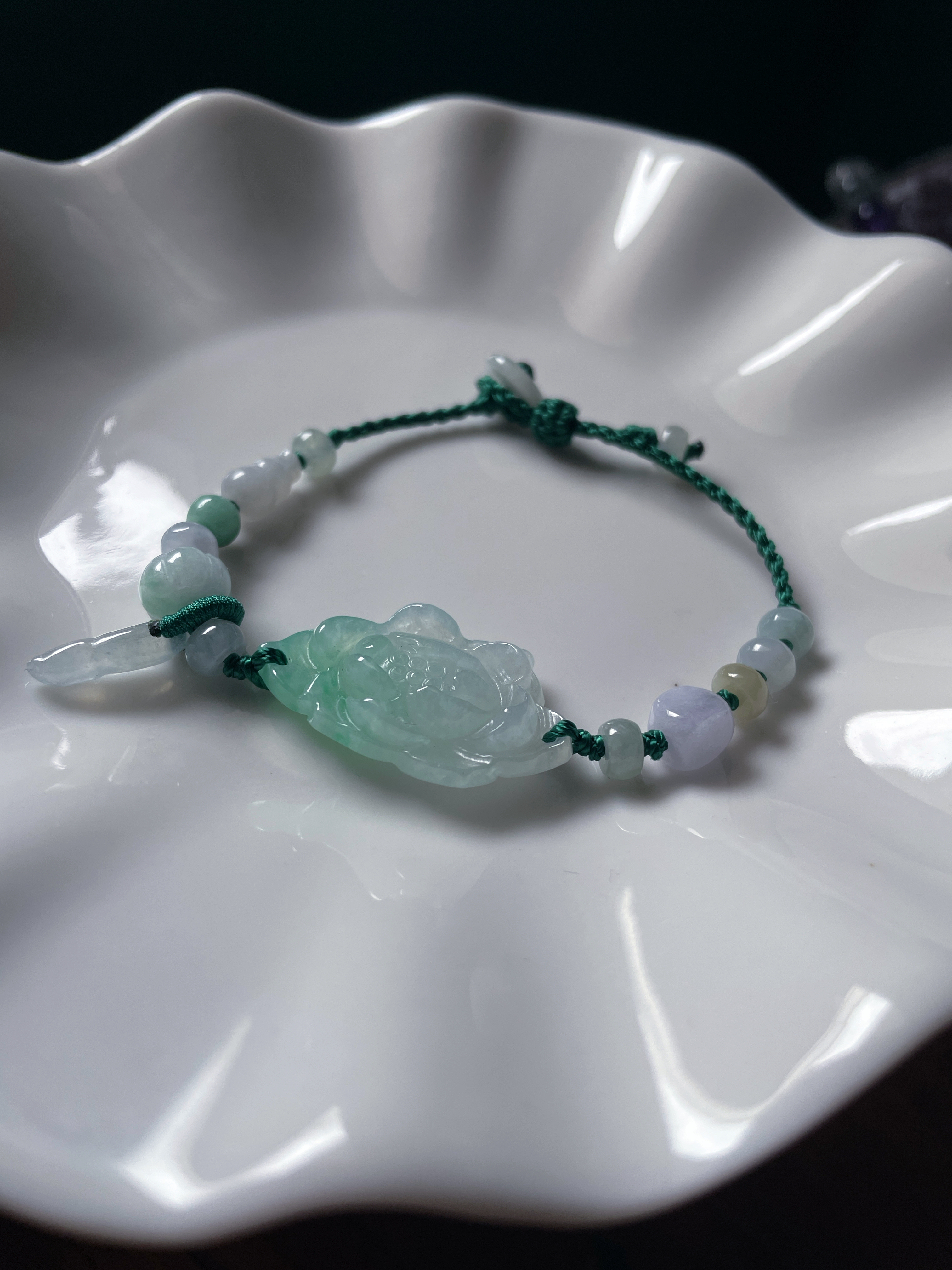 天然a货翡翠飘绿一品青莲花雕刻随形南瓜珠好事花生编绳手绳手链