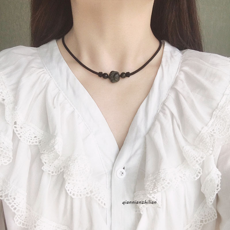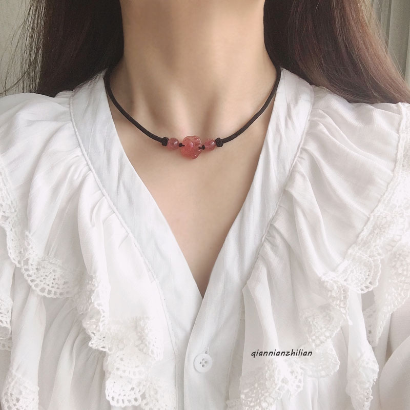天然草莓晶猫爪项链黑曜石锁骨链女男情侣款一对闺蜜黑绳水晶吊坠