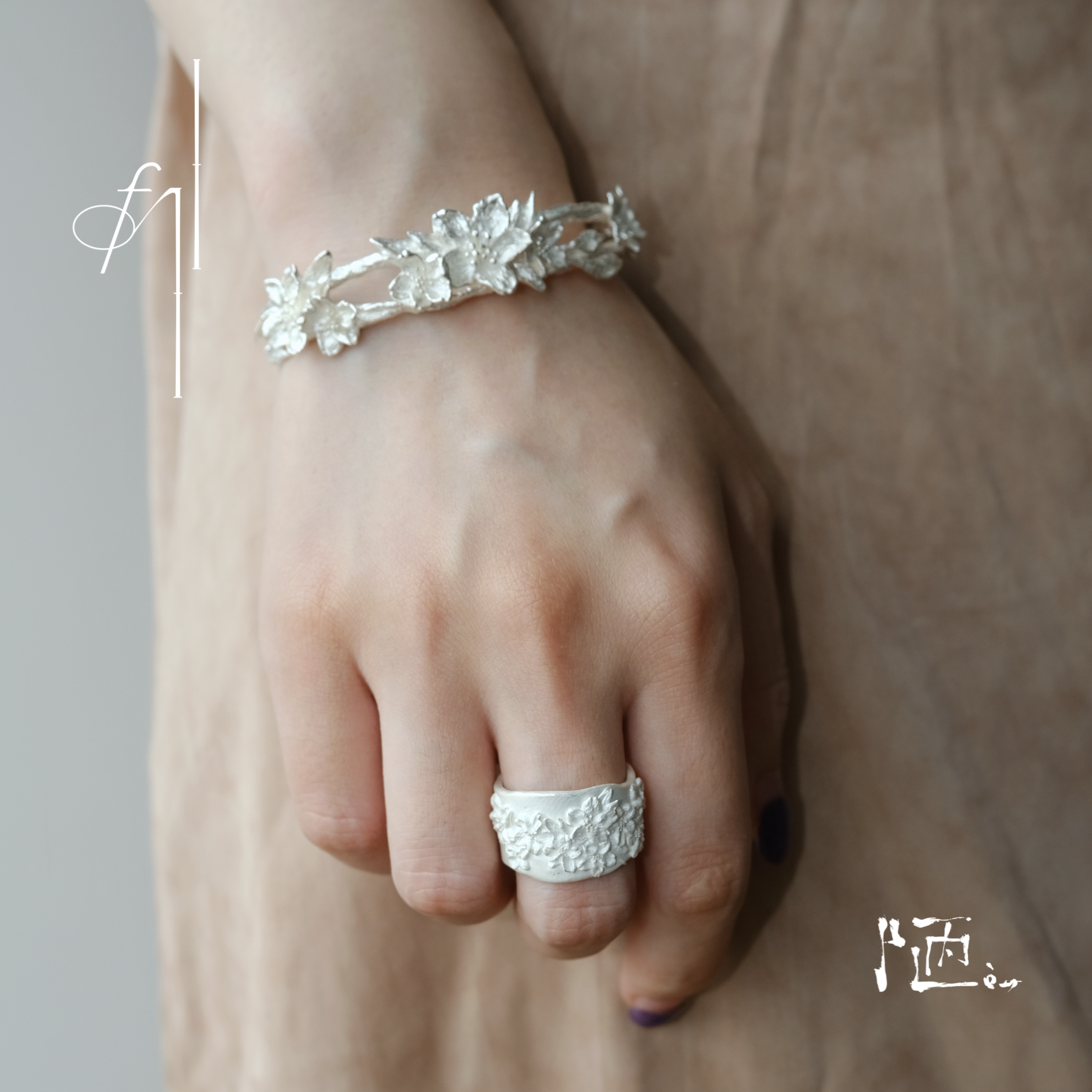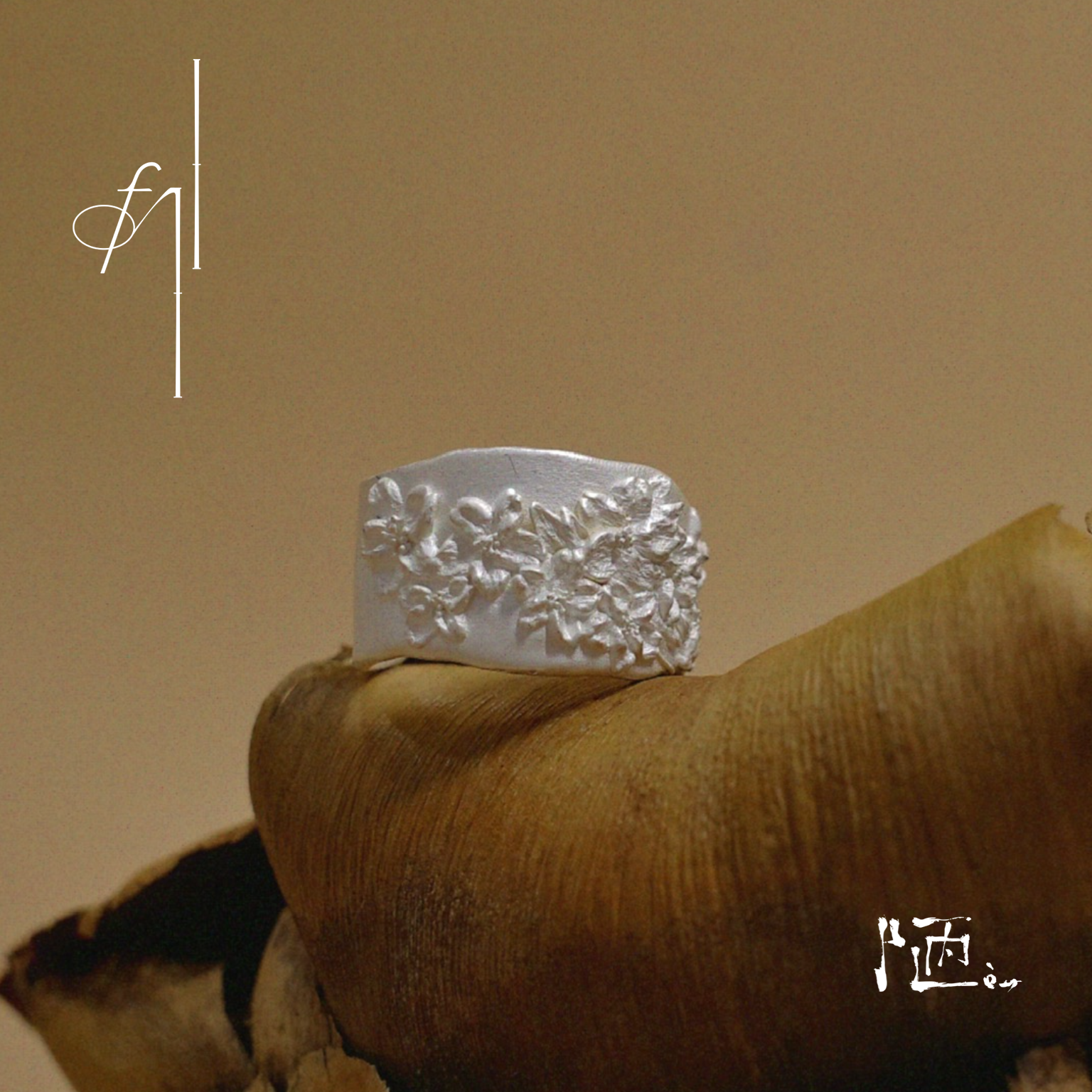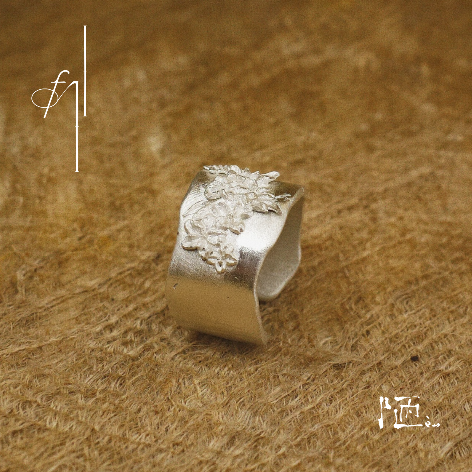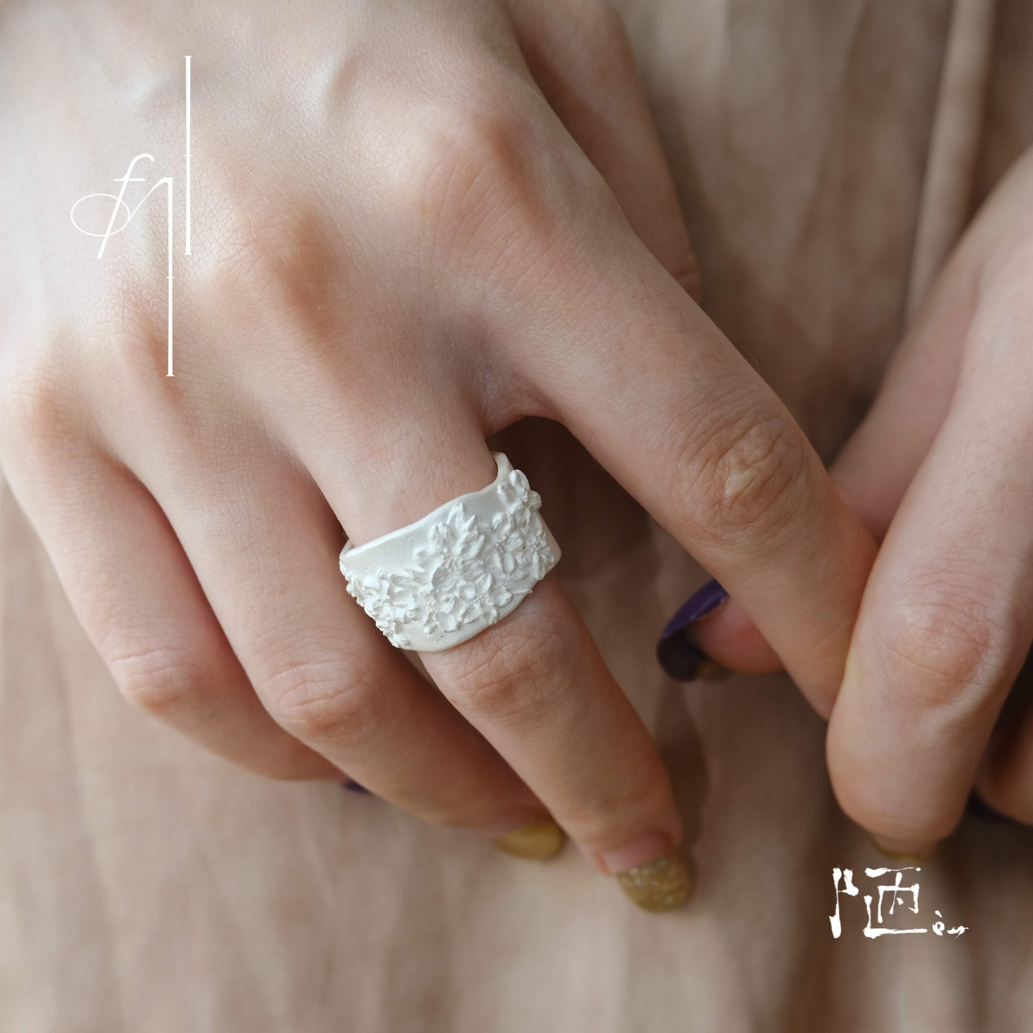 陋Lou 浮雕樱花戒指 原创设计花朵造型戒指白色925银手工新中式