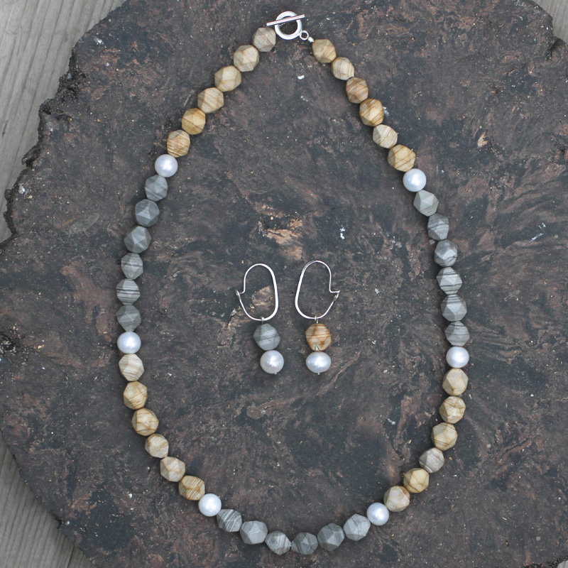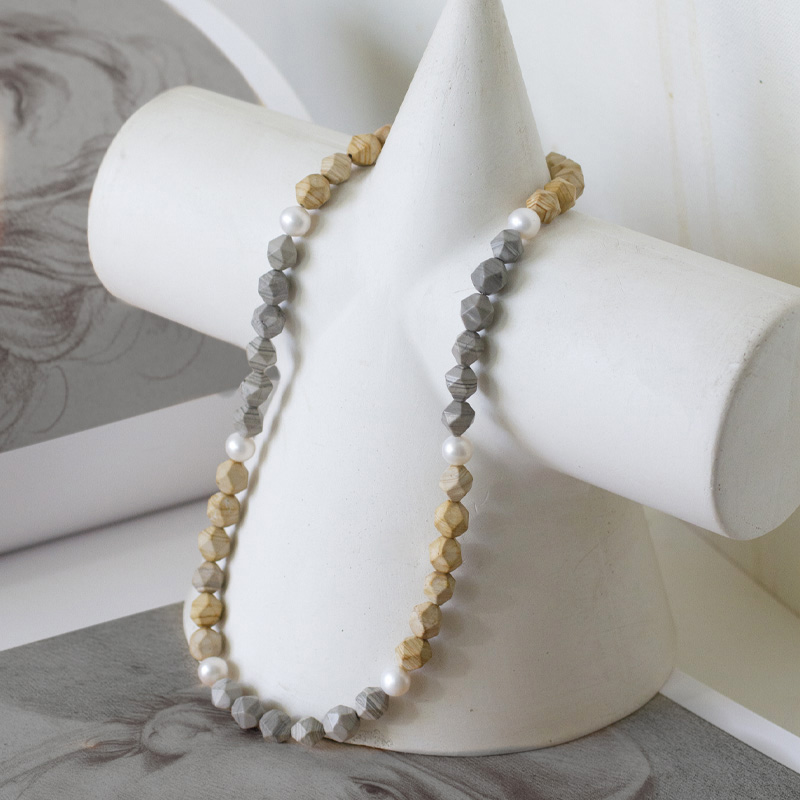朗睦原创天然艺术线纹石淡水珍珠点缀莫兰迪小众新中式串珠项链女