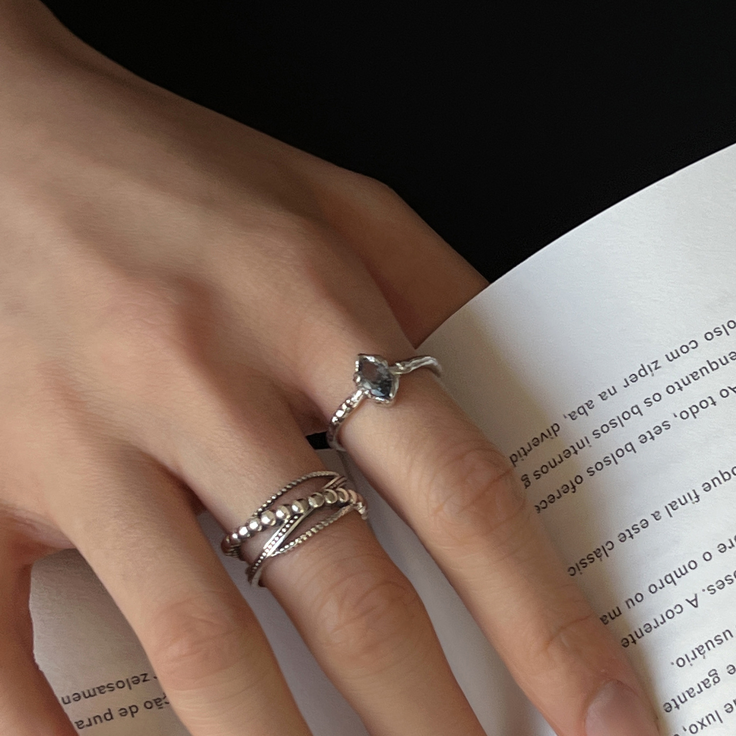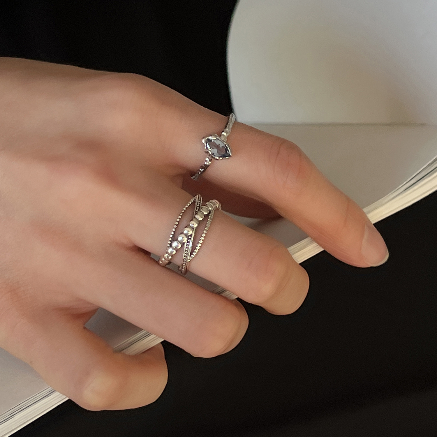 多层线条交叉戒指女复古时尚做旧百搭S925银开口指环嘻哈食指戒潮