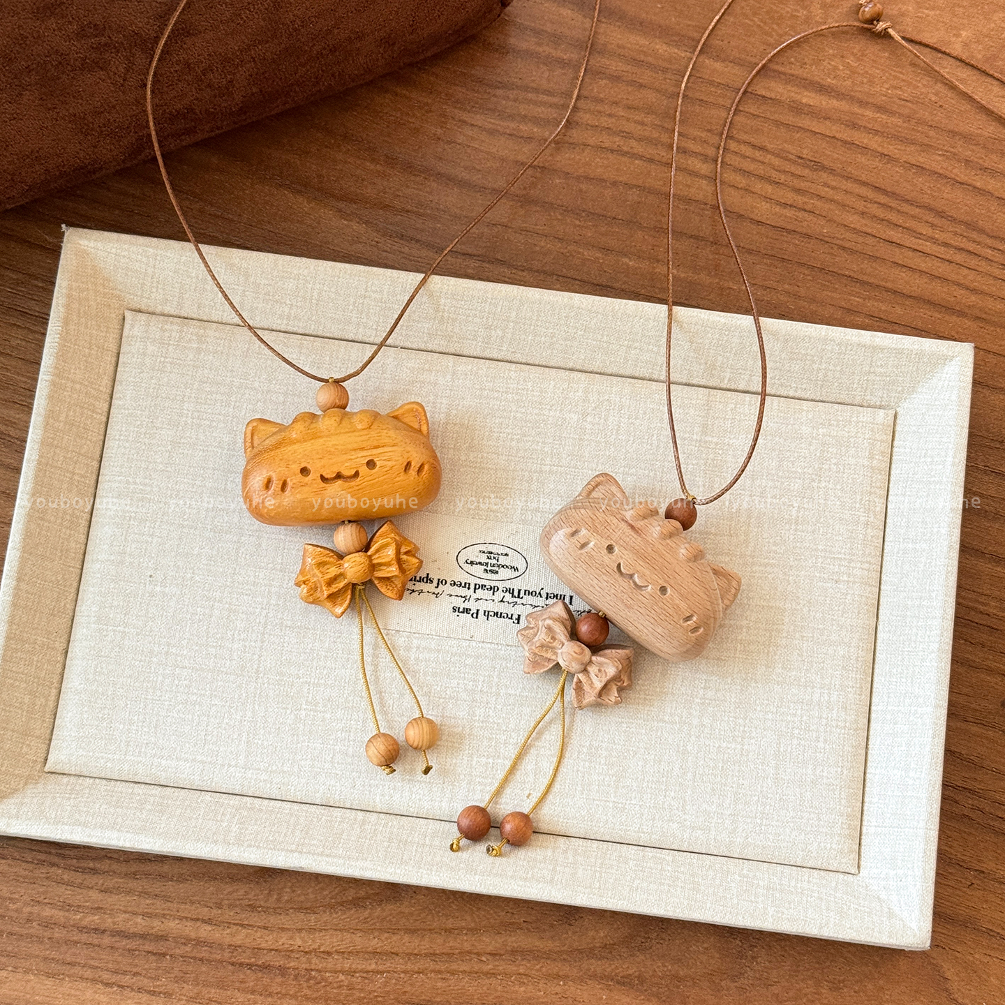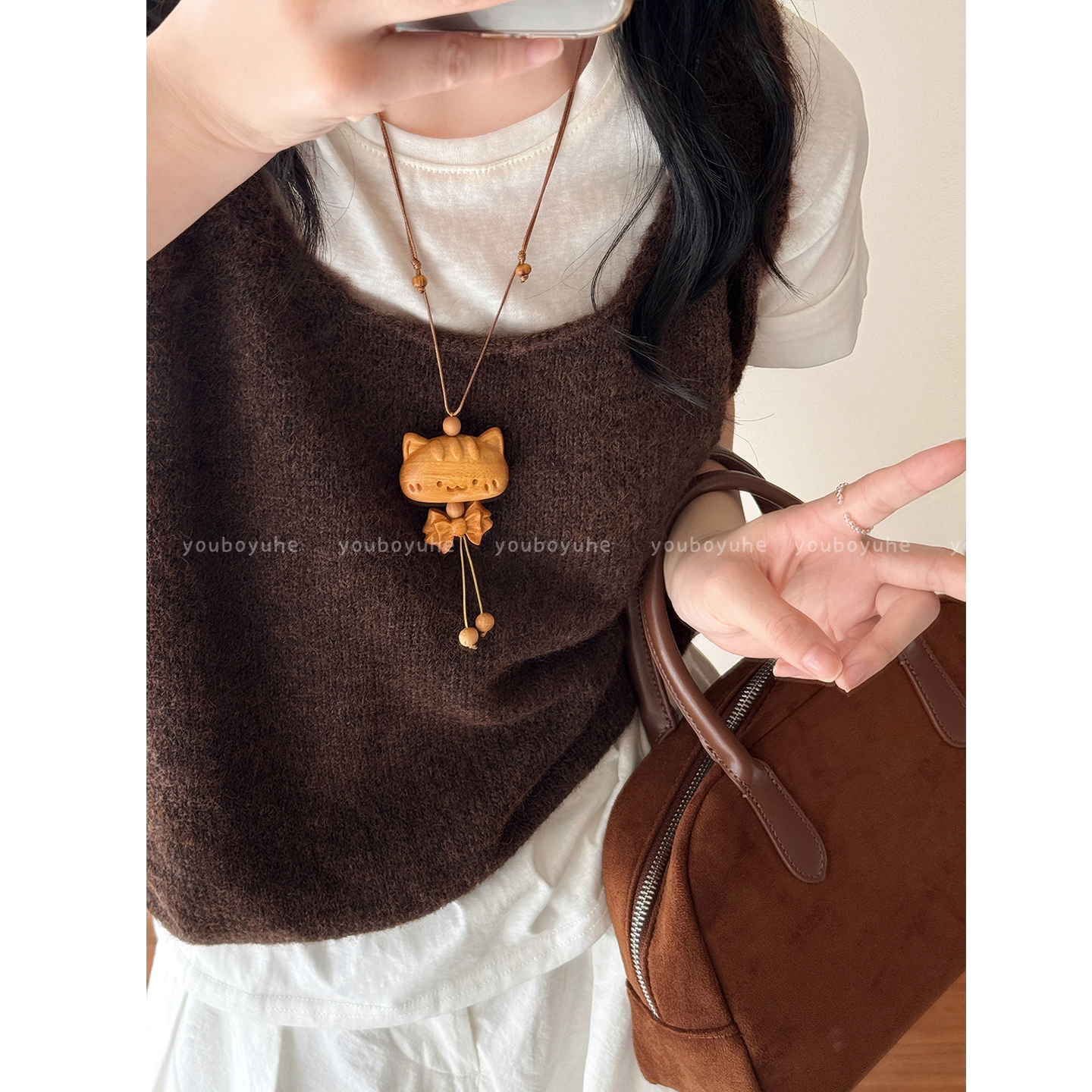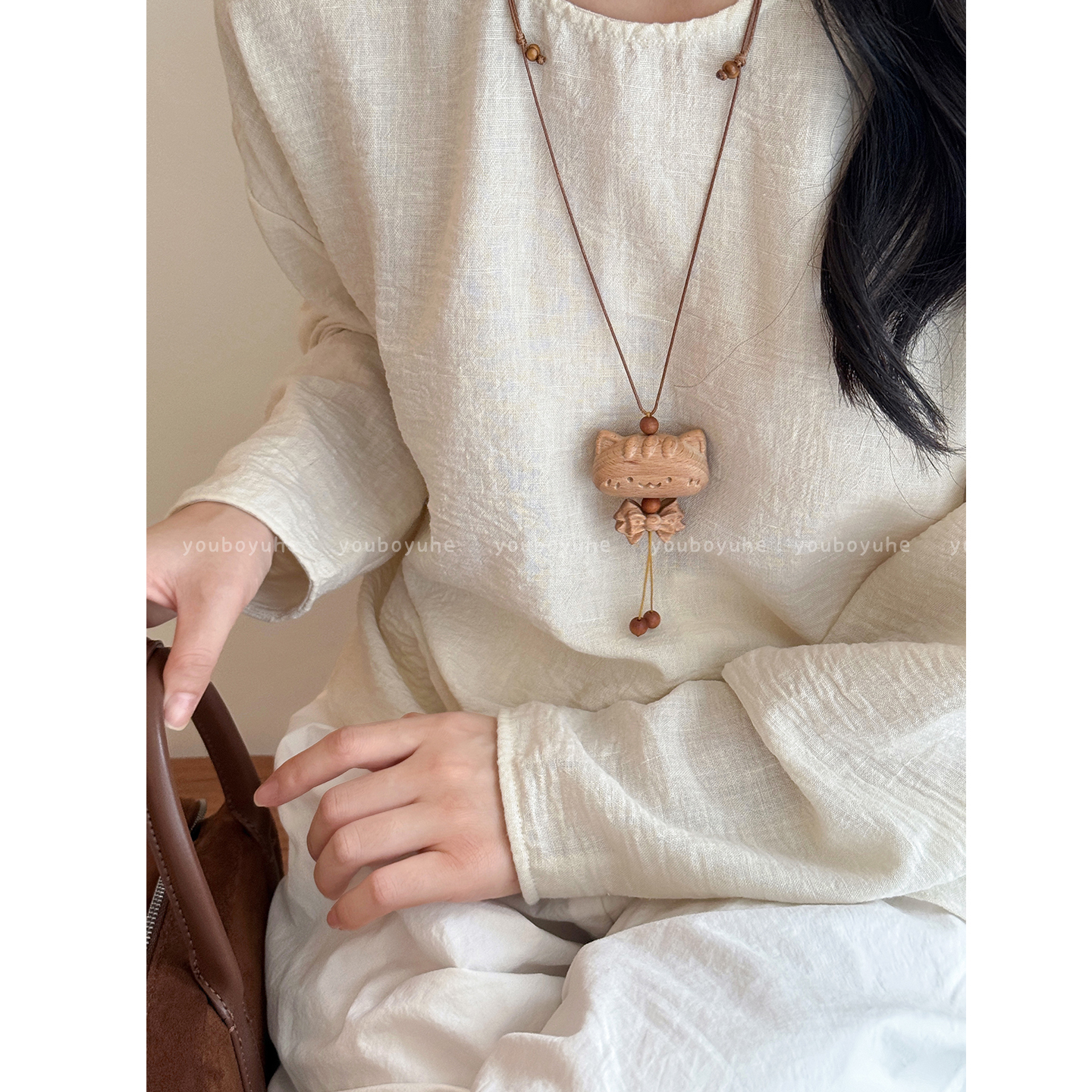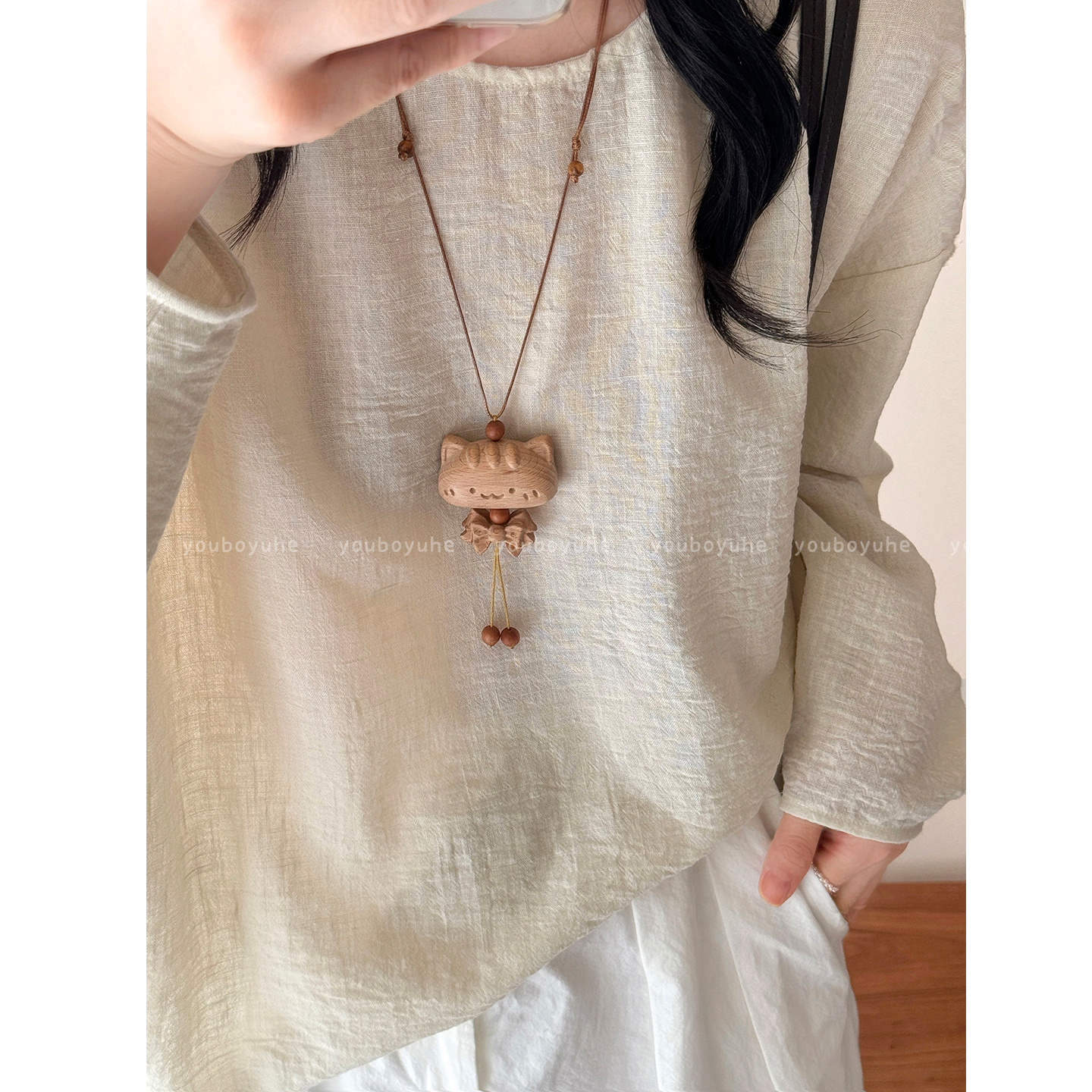 手作雕刻~法棍小猫檀木长款吊坠项链女款日常百搭毛衣链小众配饰