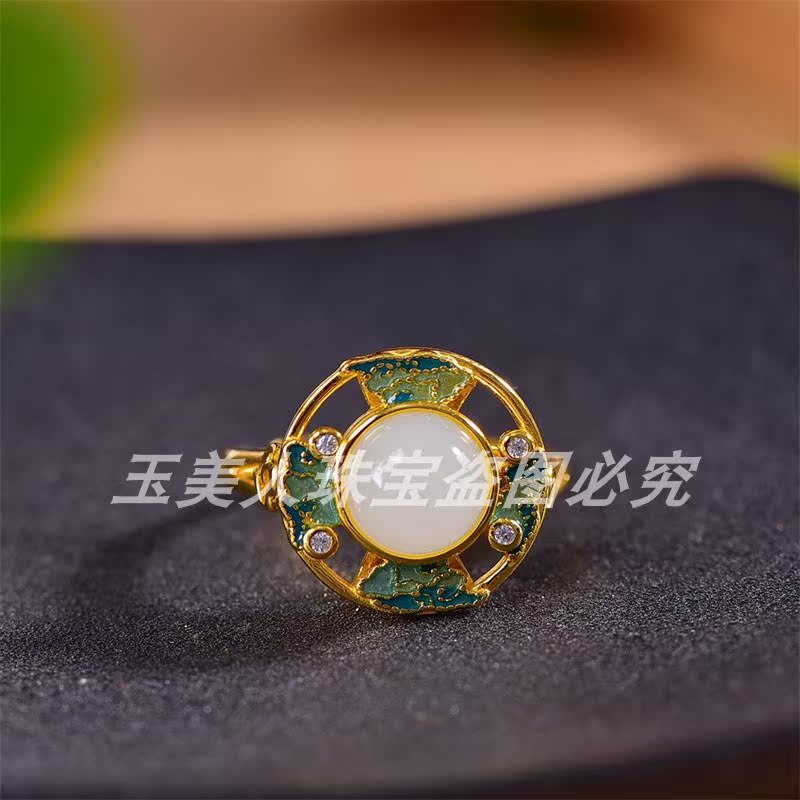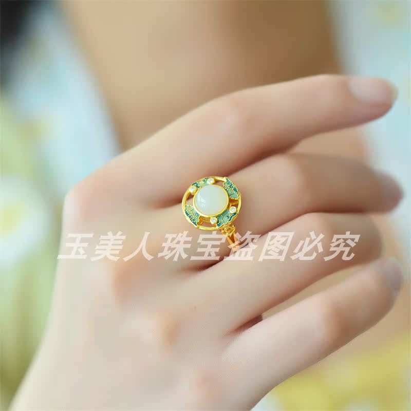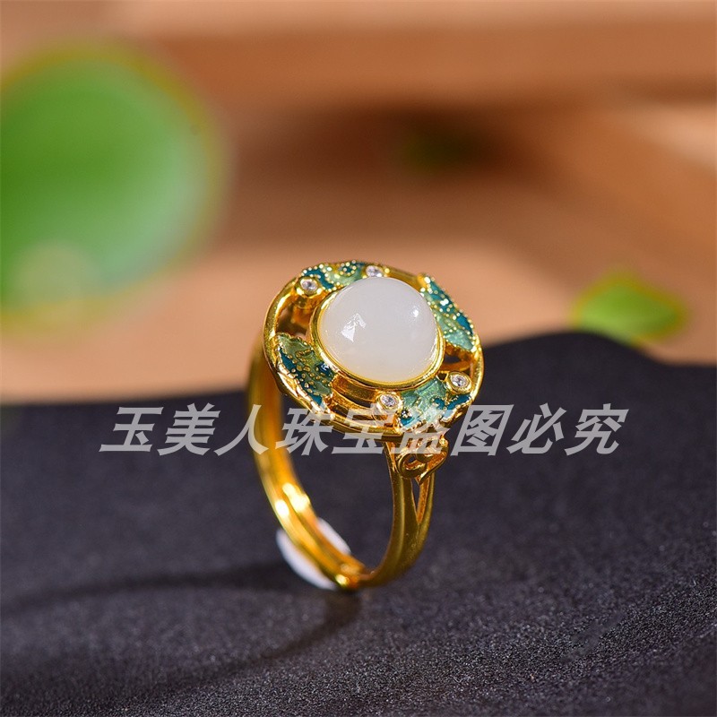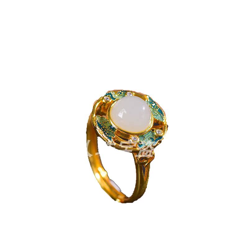925银镶嵌和田玉白玉圆蛋面珐琅配白锆戒指女款指环可调节戒圈