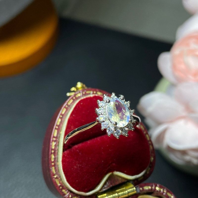 XBK 精品925戒指,*5月光石活口蓝6mm玻璃体月光天然镶嵌银