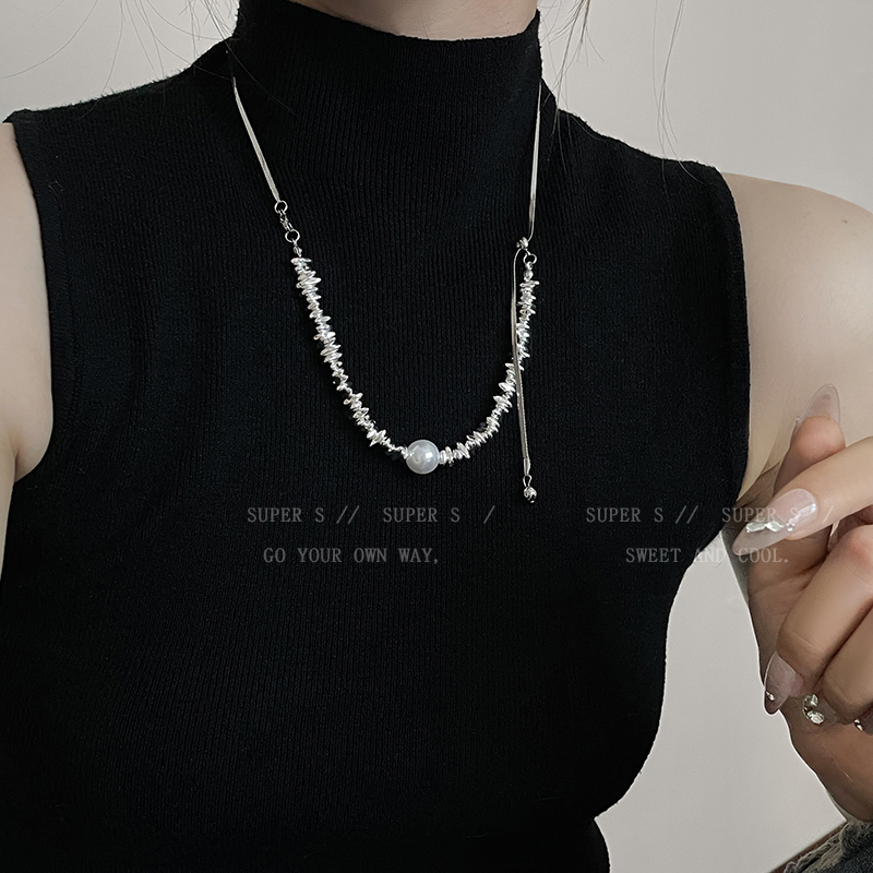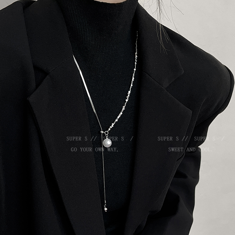 碎银珍珠拼接挂脖项链女叠戴长款吊坠抽拉毛衣链韩式设计感配饰品
