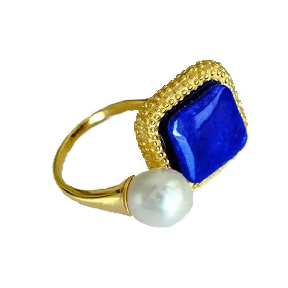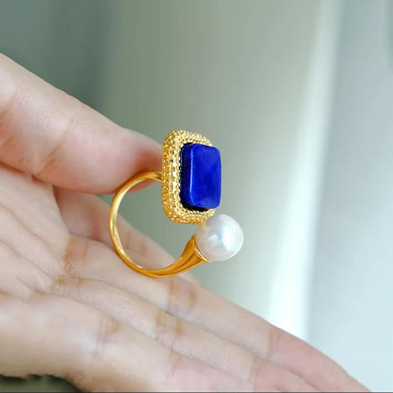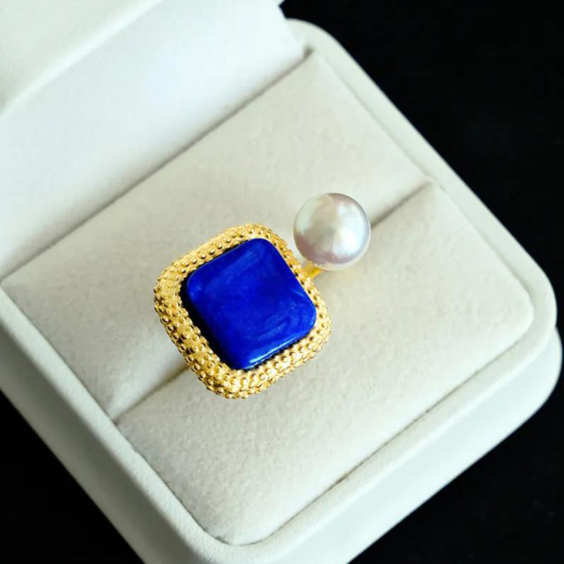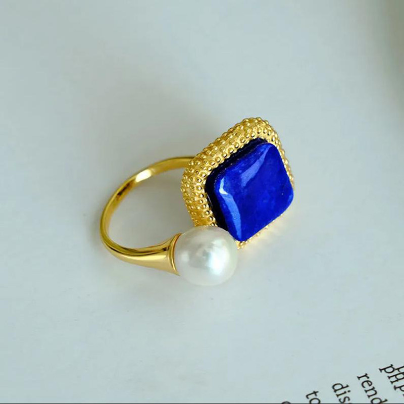 仿青金石方形几何戒指古风镀18K金小众文艺高级感戒指人造珍珠戒