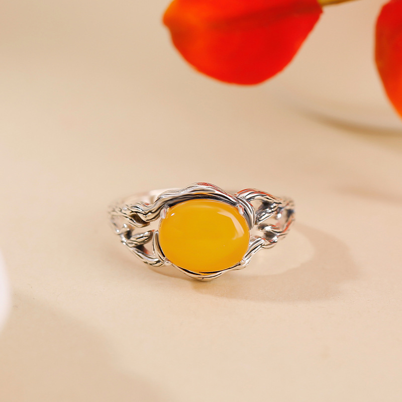 悦宝珠宝蜜蜡S925纯银树枝树叶枝蔓蛋面椭圆设计感银戒指工厂直销