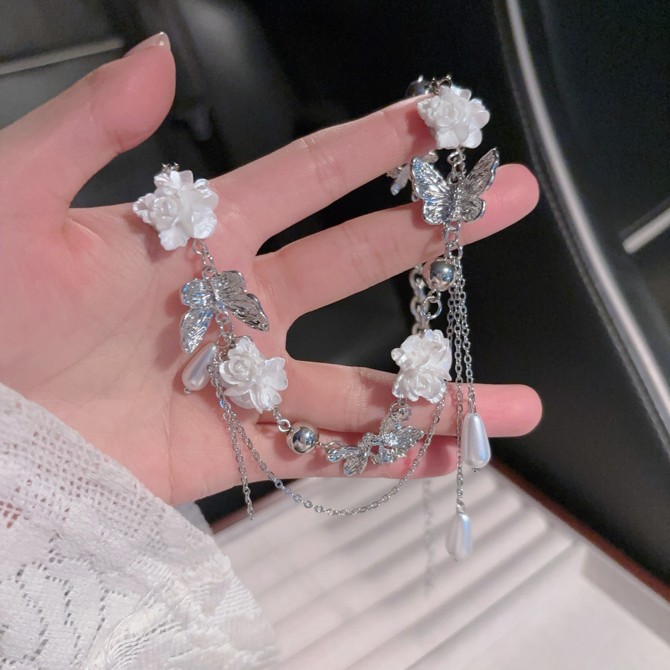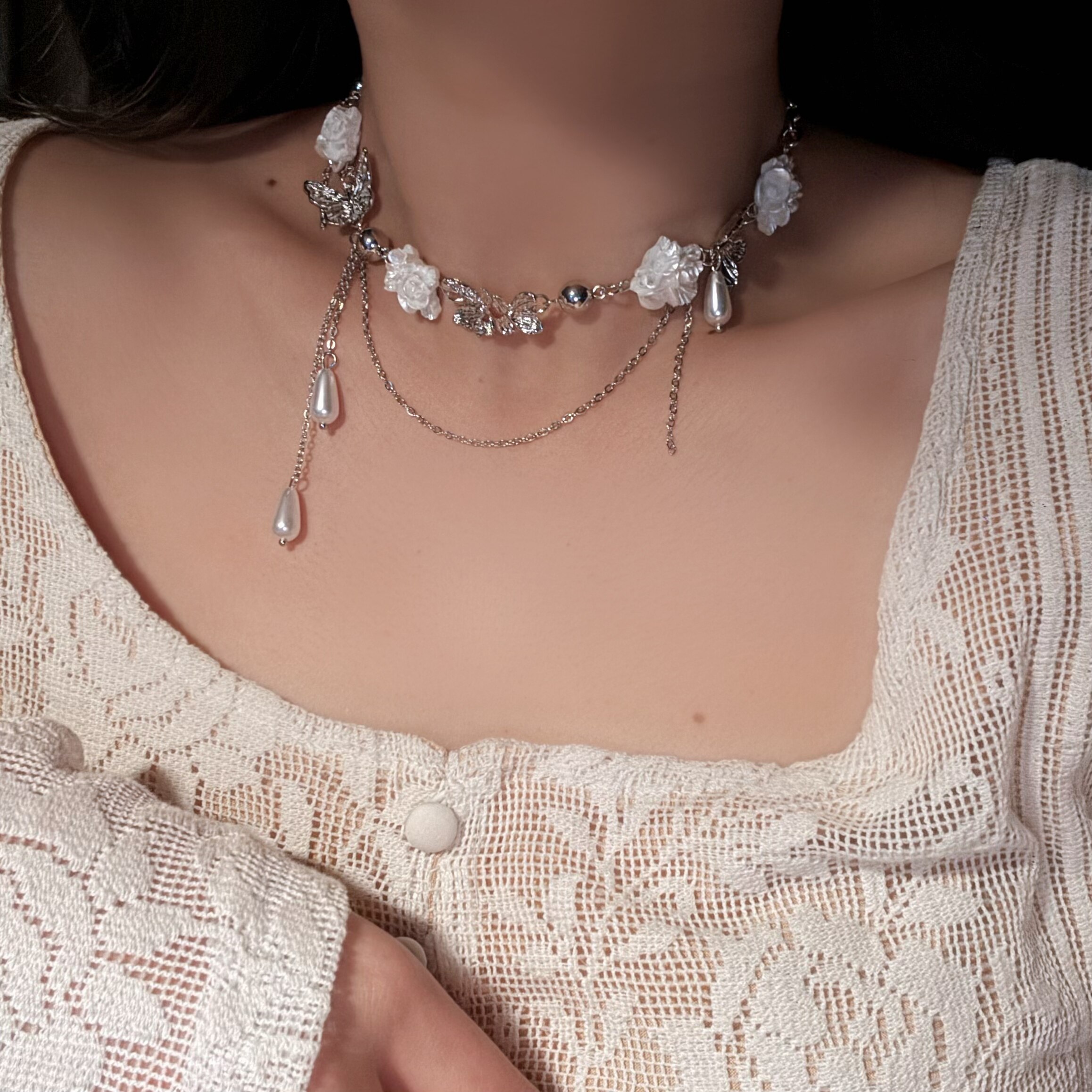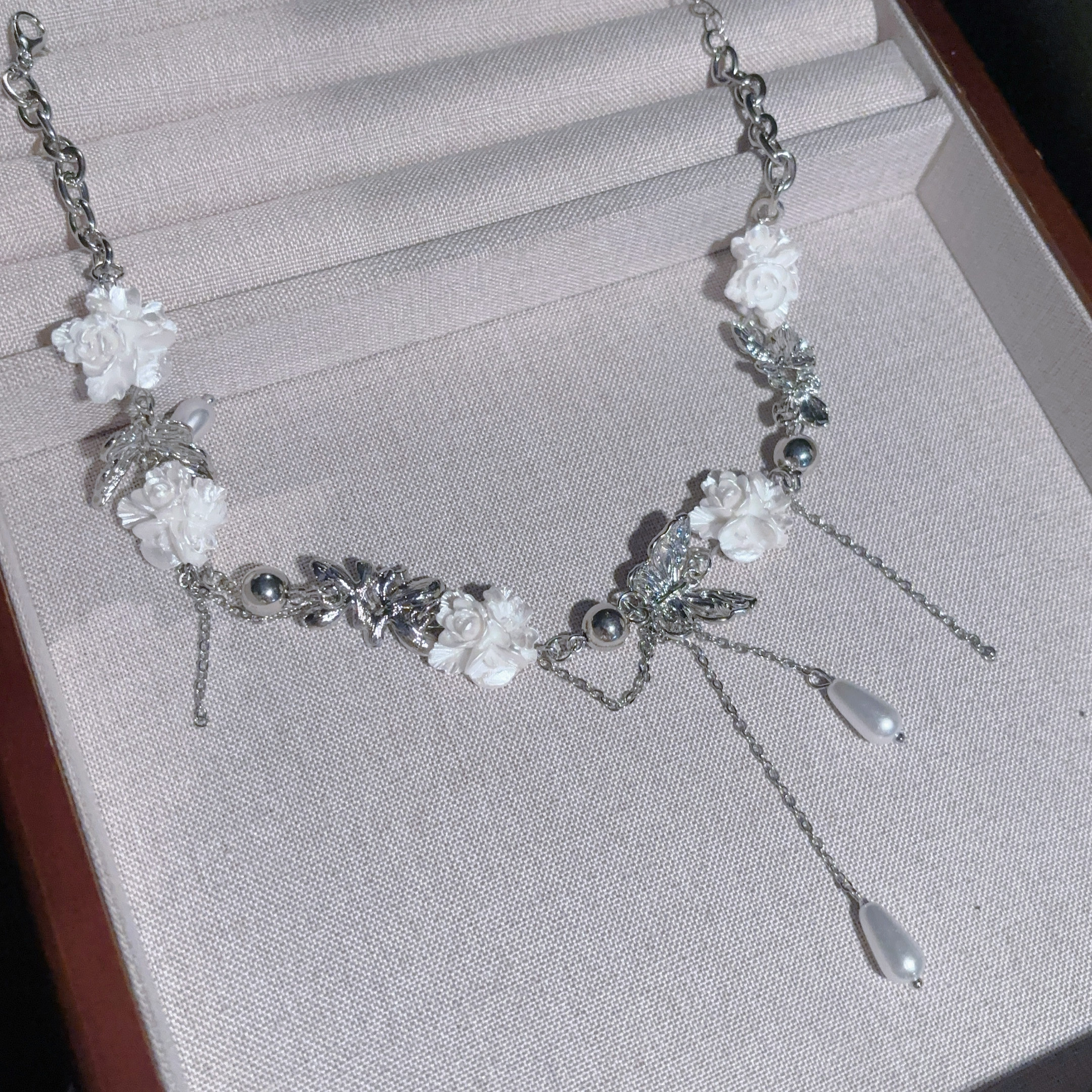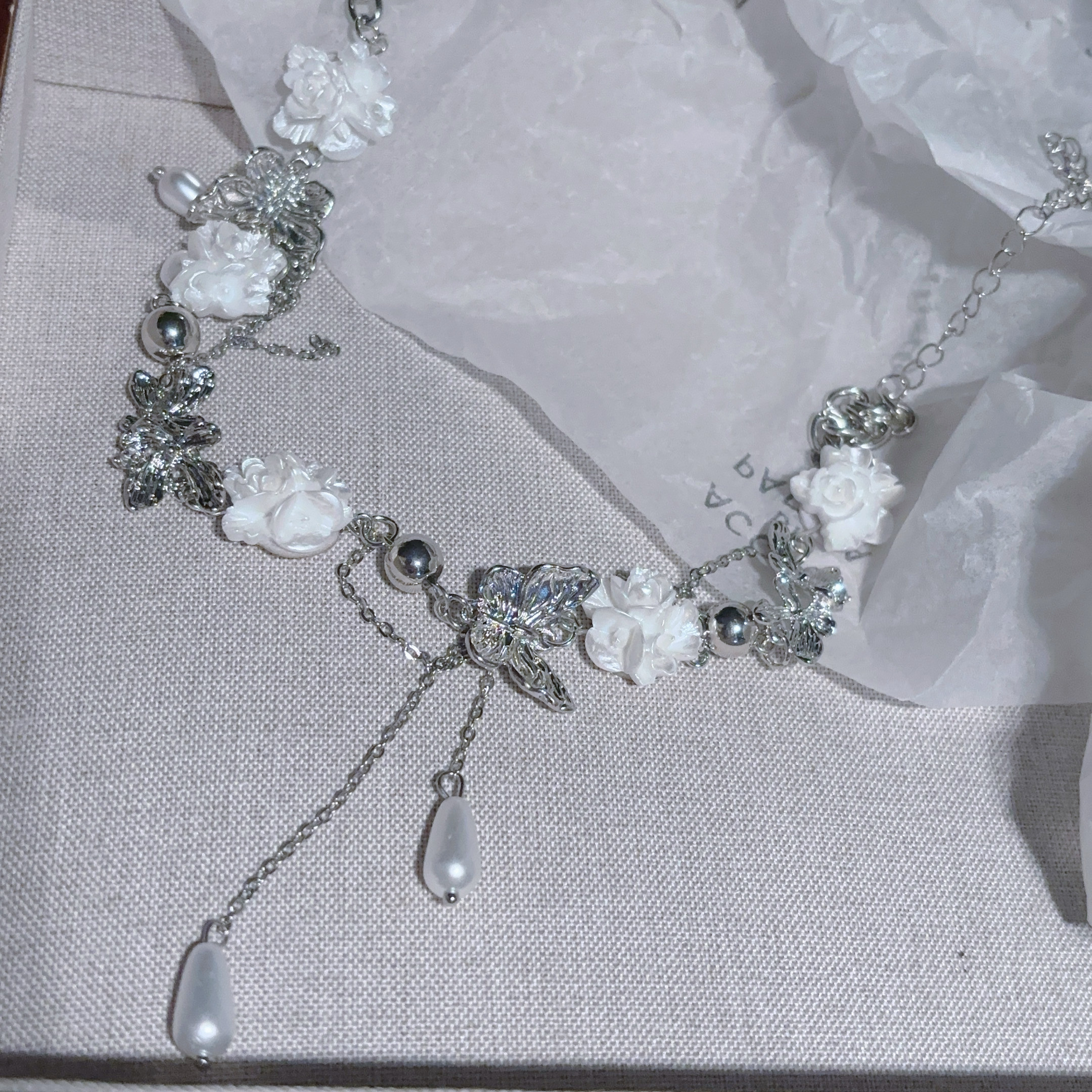 法式白色茉莉花朵蝴蝶项链女珍珠流苏吊坠颈链轻奢高级感锁骨链