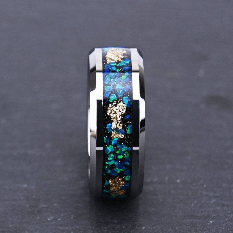 蓝色倒角平面男士戒指镶嵌轻奢宽欧珀加婚戒现货戒指金箔8钨钢