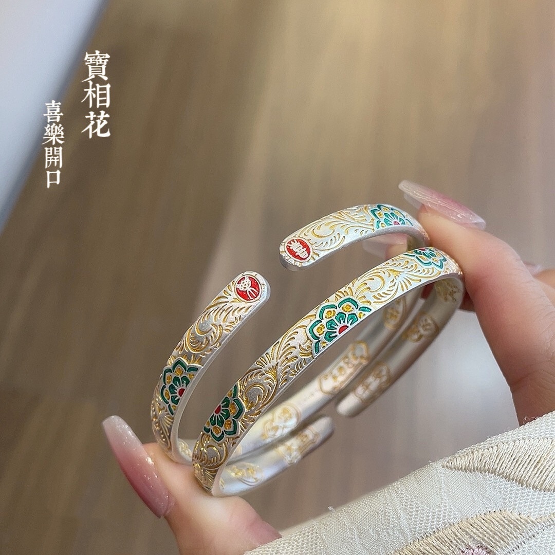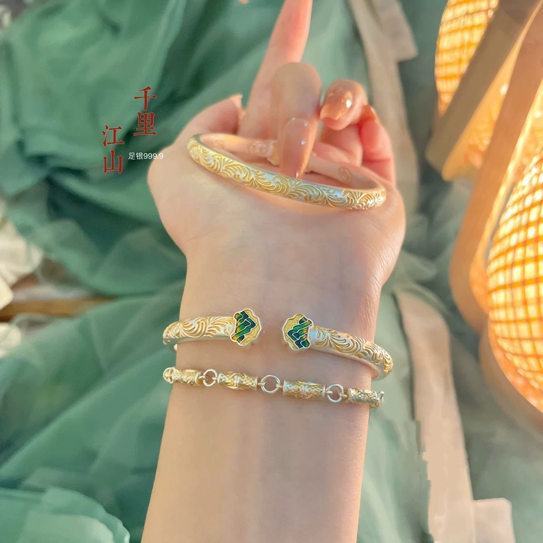 新中式足银9999描金如意吉言手镯女开口国风千里江山珐琅纯银镯子
