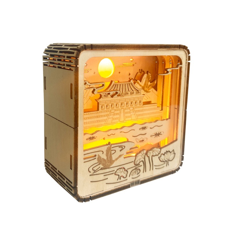 故宫月色木雕灯DIY立体小夜灯木质拼插摆件卧室小夜灯3D光影定制