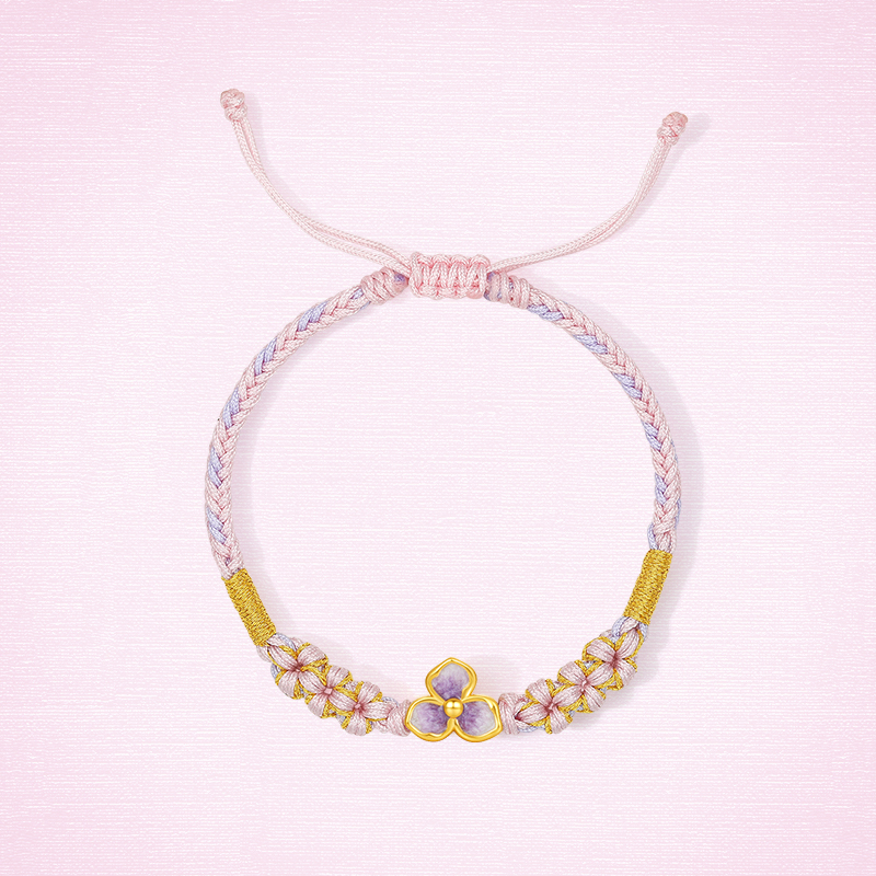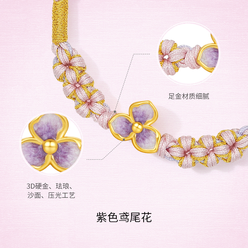 周六福黄金手绳女款3d硬金定价紫色鸢尾花浪漫梦幻花语转运珠手绳