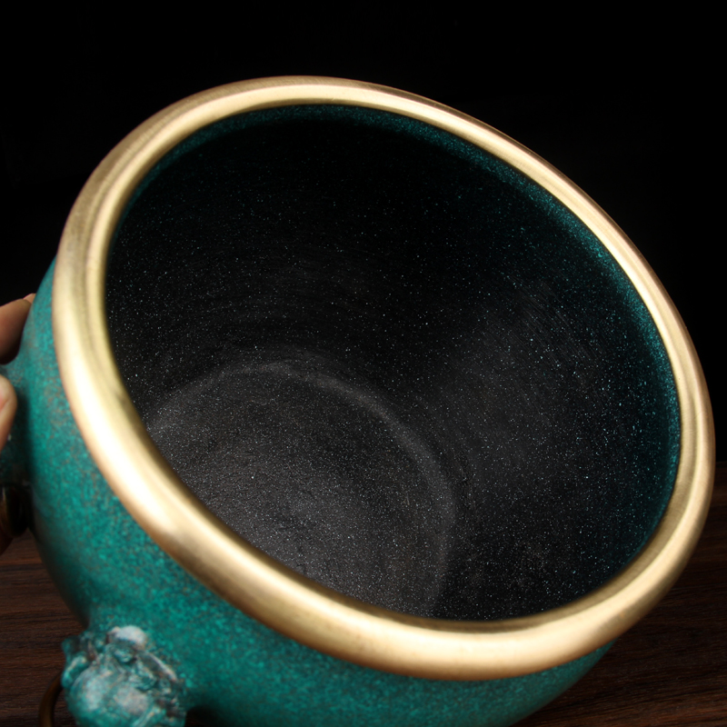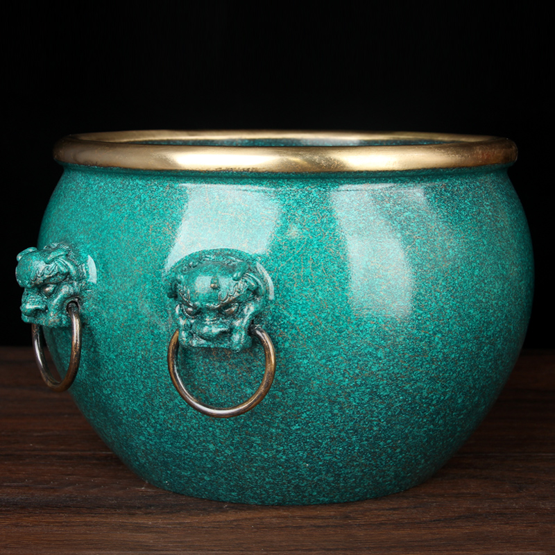 彩绘绿铜缸摆件 铜大水缸摆件 铜聚宝盆缸摆件