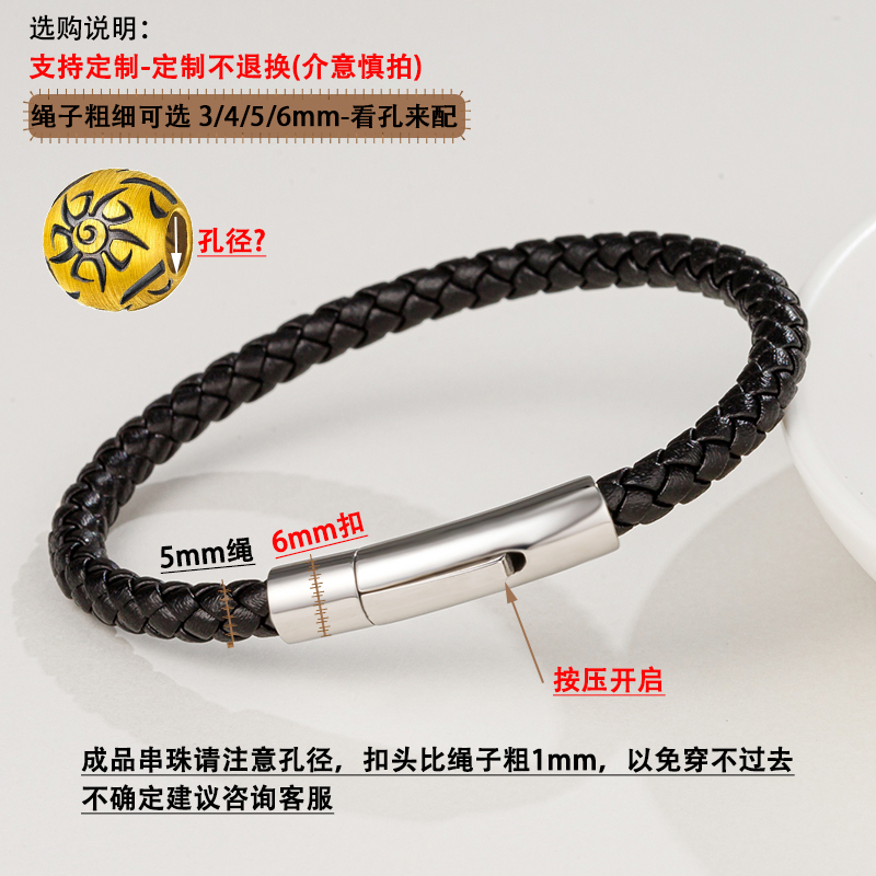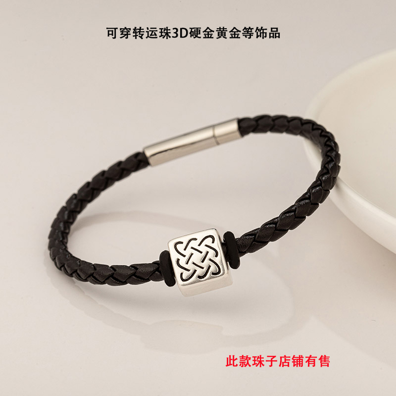 银色一字扣真皮手链转运珠配绳可穿3D硬金潘多拉珠子百搭串珠手绳
