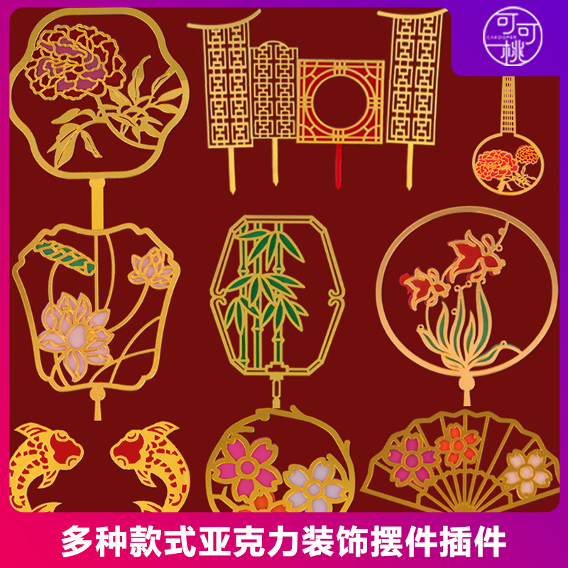 中式生日宴甜品台装饰红金祥云五件套亚克力蛋糕插件婚庆屏风摆件