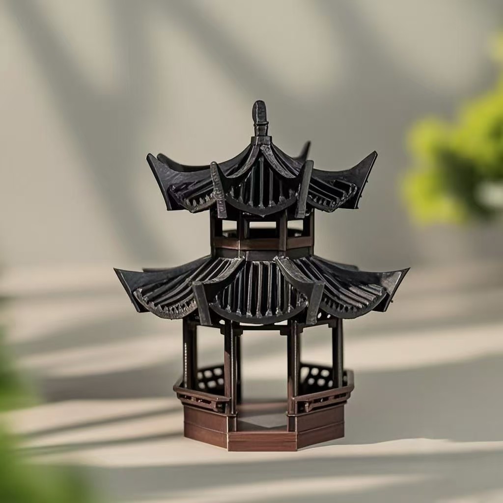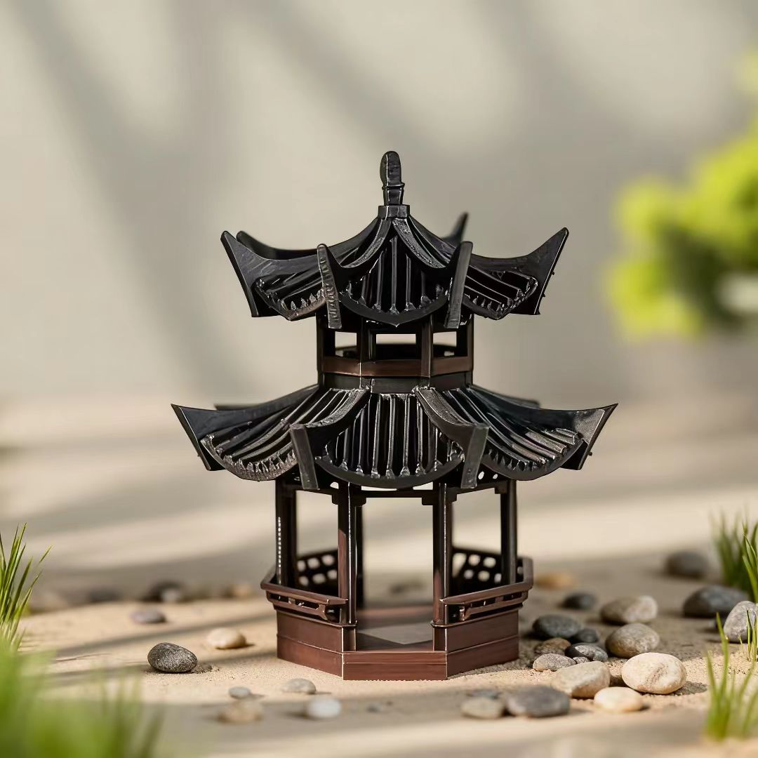 新年古建筑摆件双层六角亭国风微景观水陆缸鱼缸假山盆景3D摆件