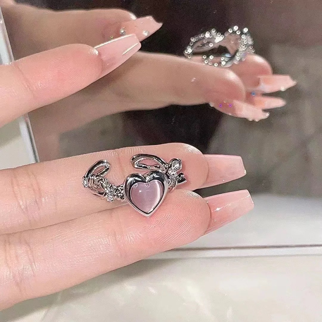 粉色爱心猫眼石戒指女潮小众设计感开口可调节指环时尚个性食指戒