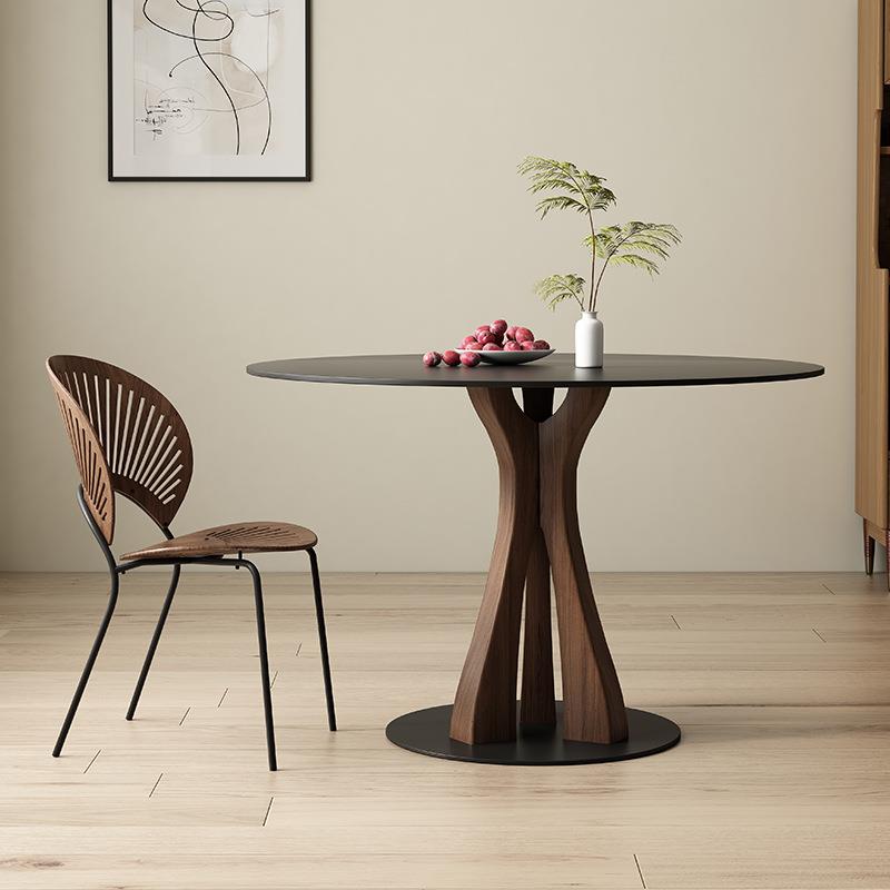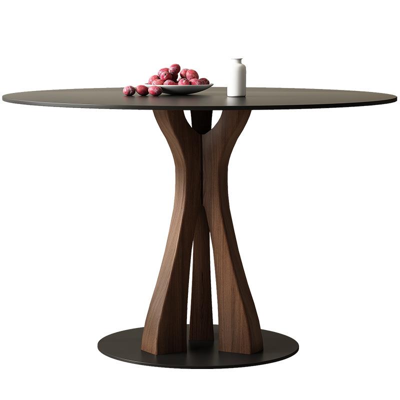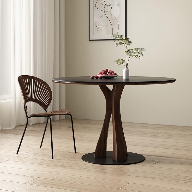 然鼓多塔黑胡桃色复古实木圆形餐桌小户型简约纯黑德利丰岩板圆桌