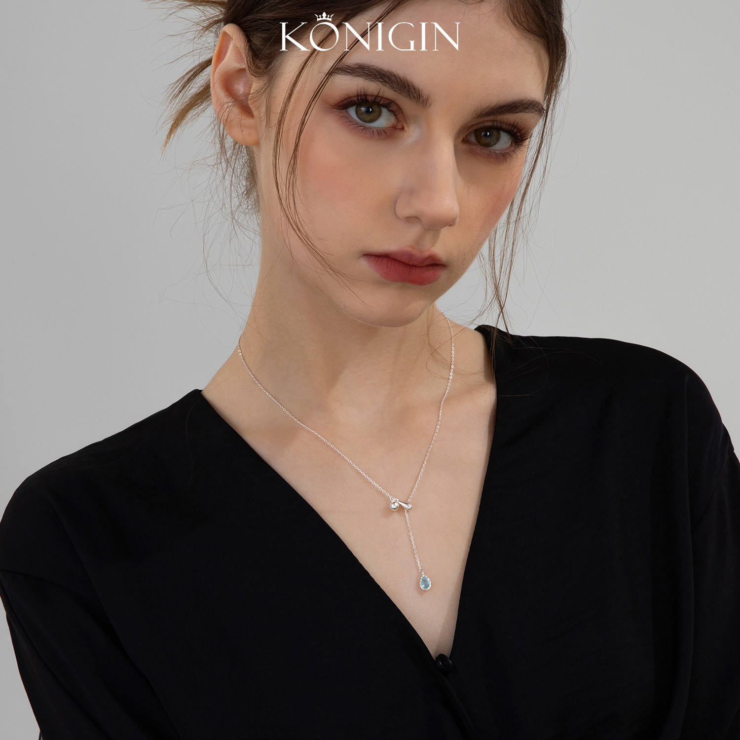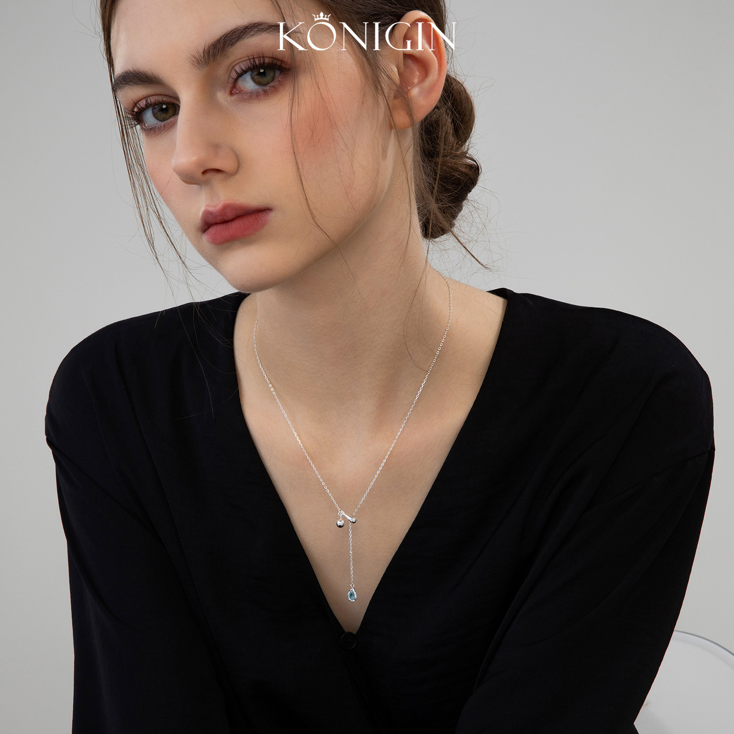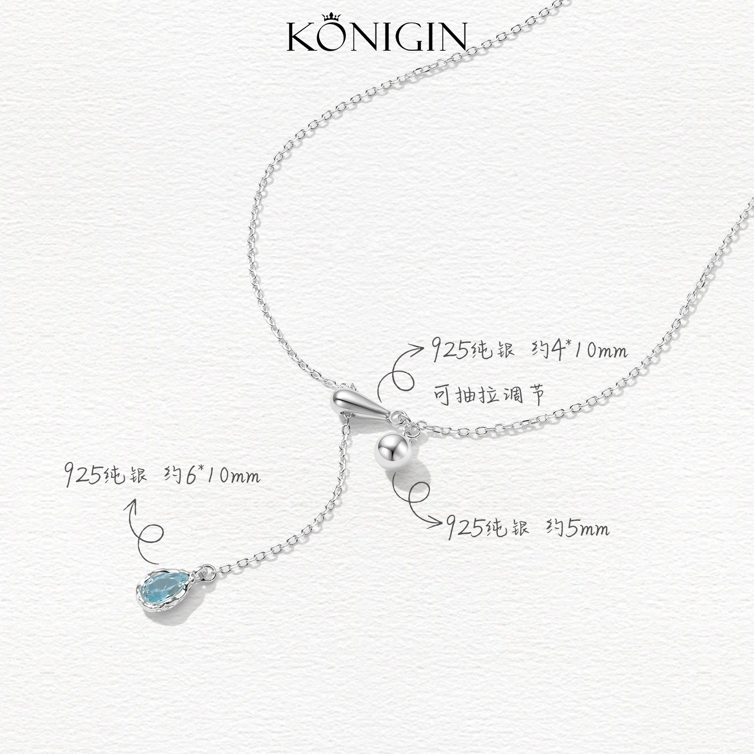 Konigin925纯银蓝色水滴项链女可调节抽拉款简约吊坠锁骨链配饰品