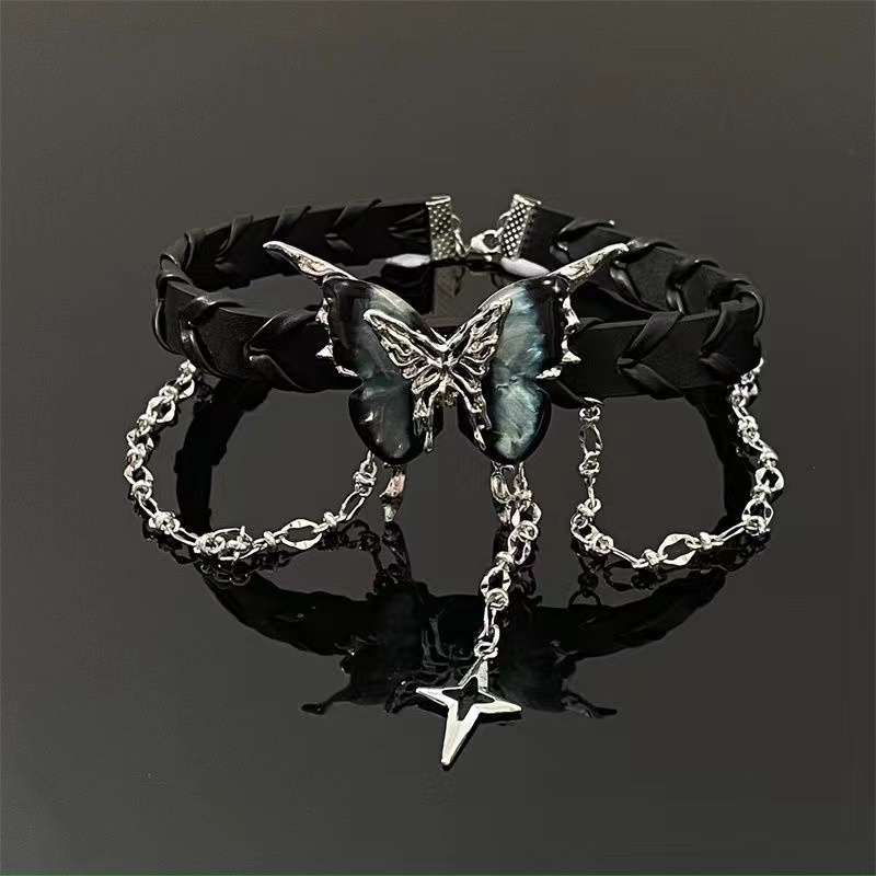 暗黑重工甜酷辣妹黑色蝴蝶芒星流苏皮革项链choker朋克潮酷项圈
