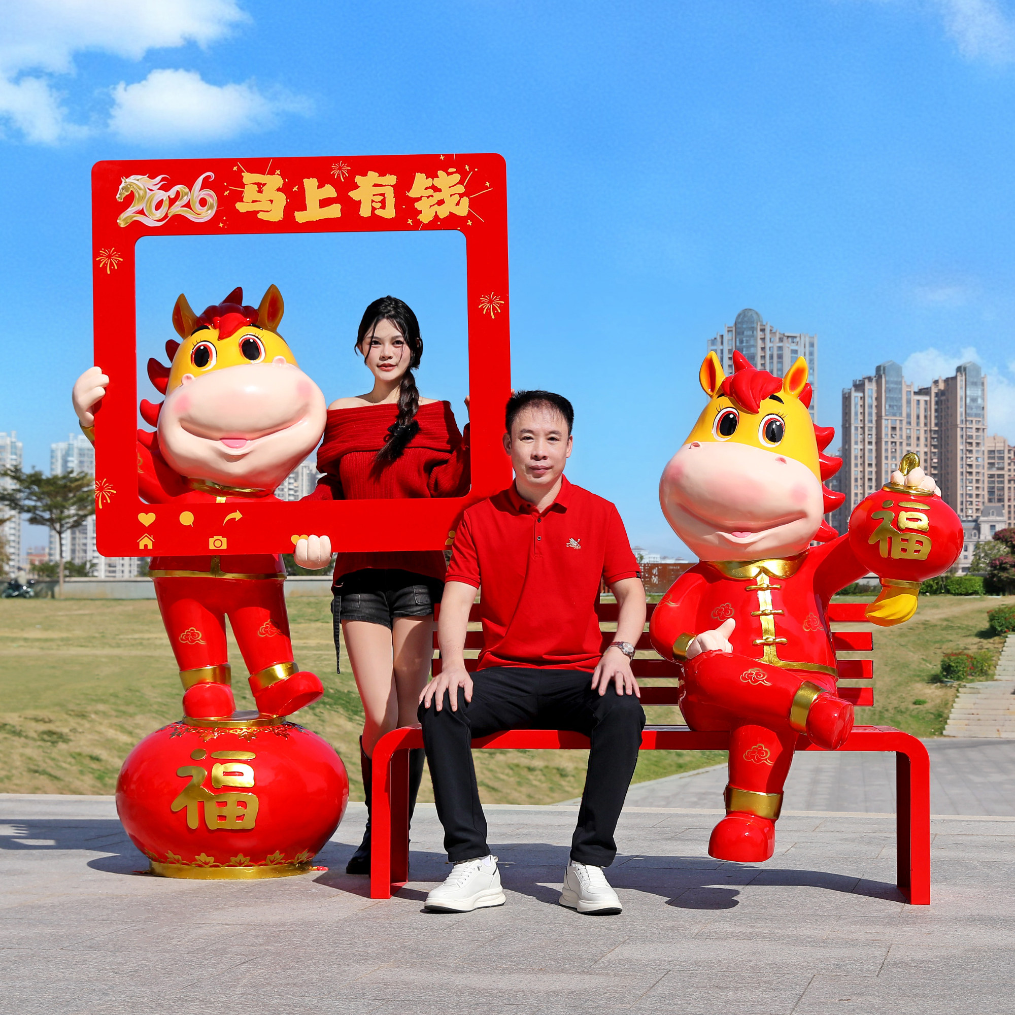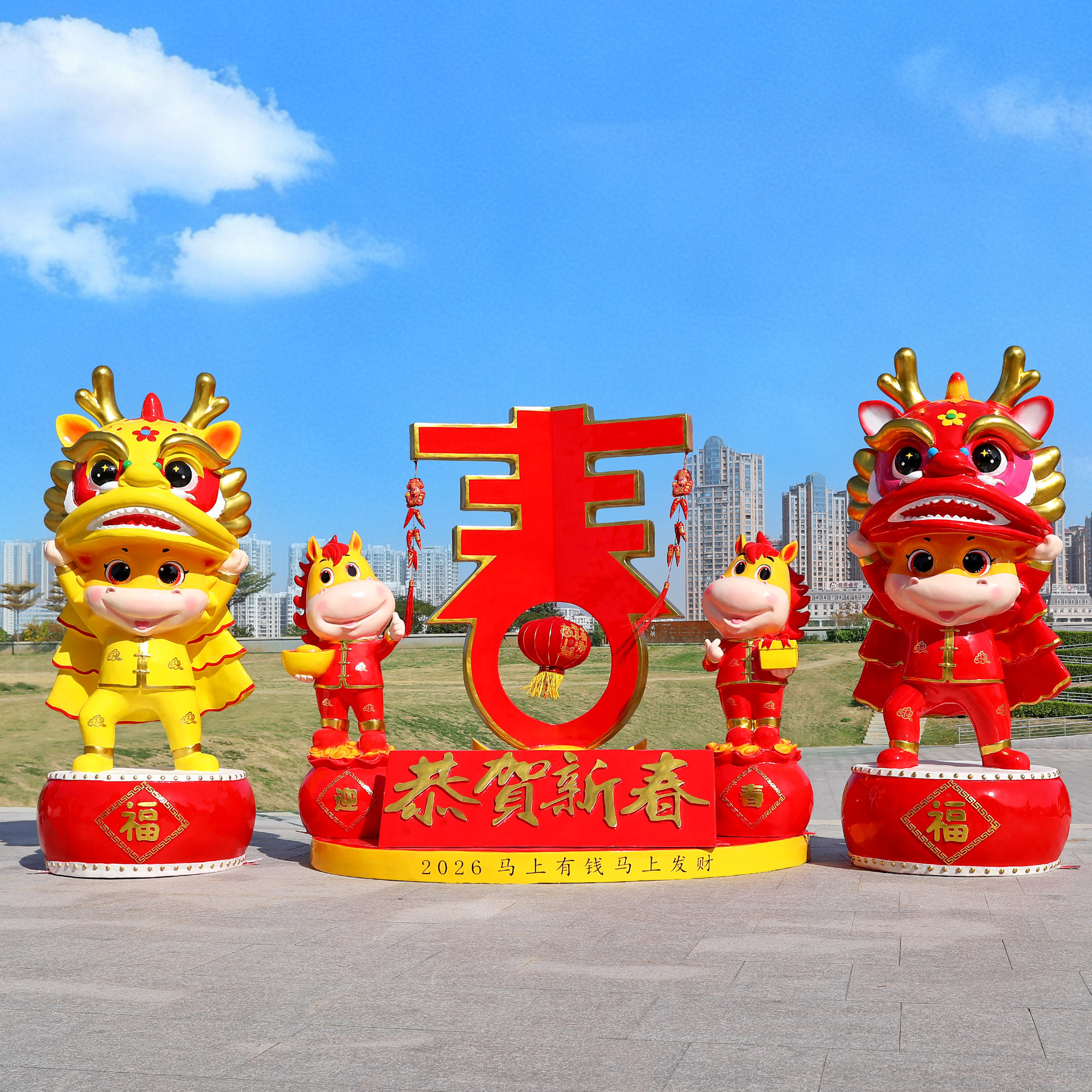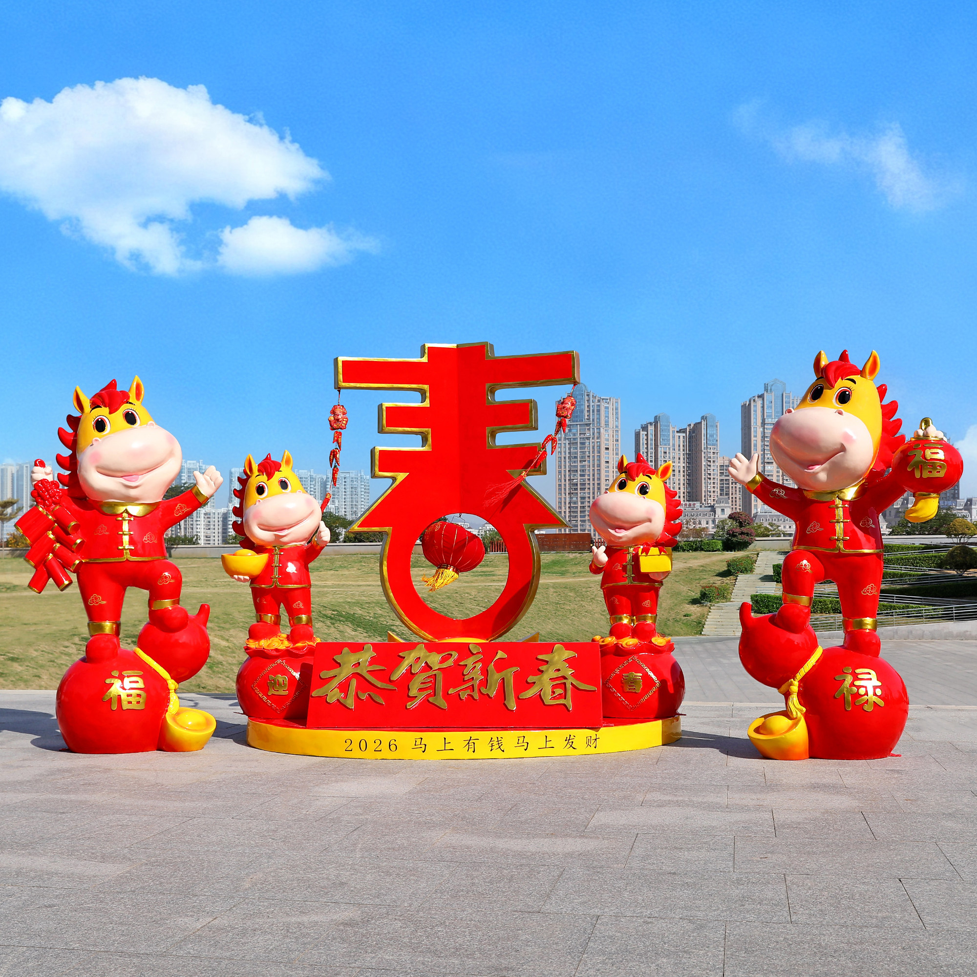 新年生肖马吉祥物卡通公仔红色装饰摆件户外步行街喜庆玻璃钢雕塑