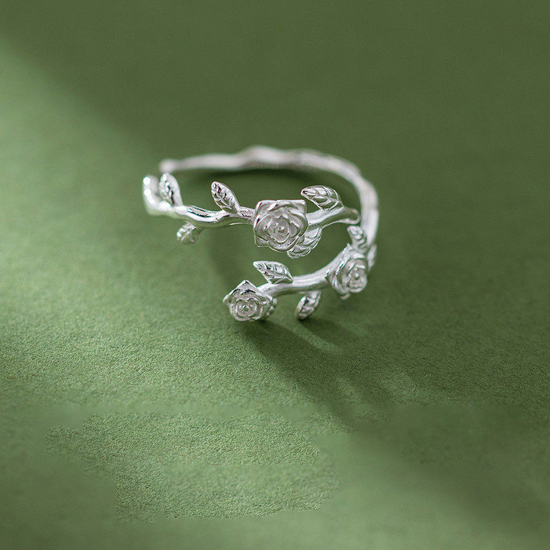 925银玫瑰花枝开口戒女新中式立体花朵藤蔓设计小众轻奢食指戒