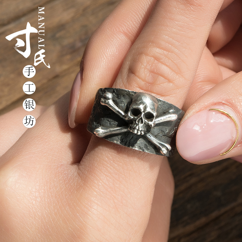 S999纯银饰品复古骷髅头开口男女款指环个性朋克风做旧戒指