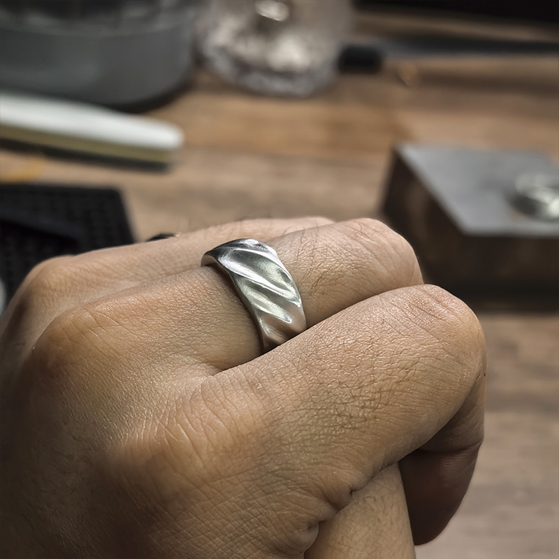 原创丝绸纹手工素银戒S999纯银戒指男女小众设计感开口可调节简约