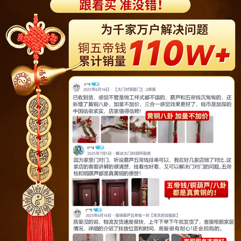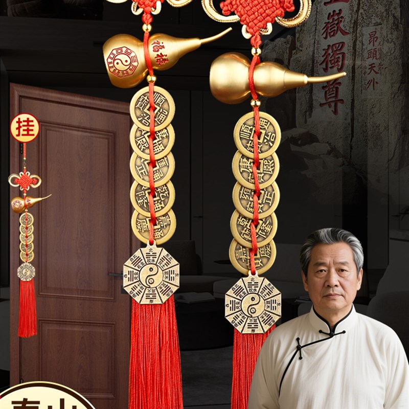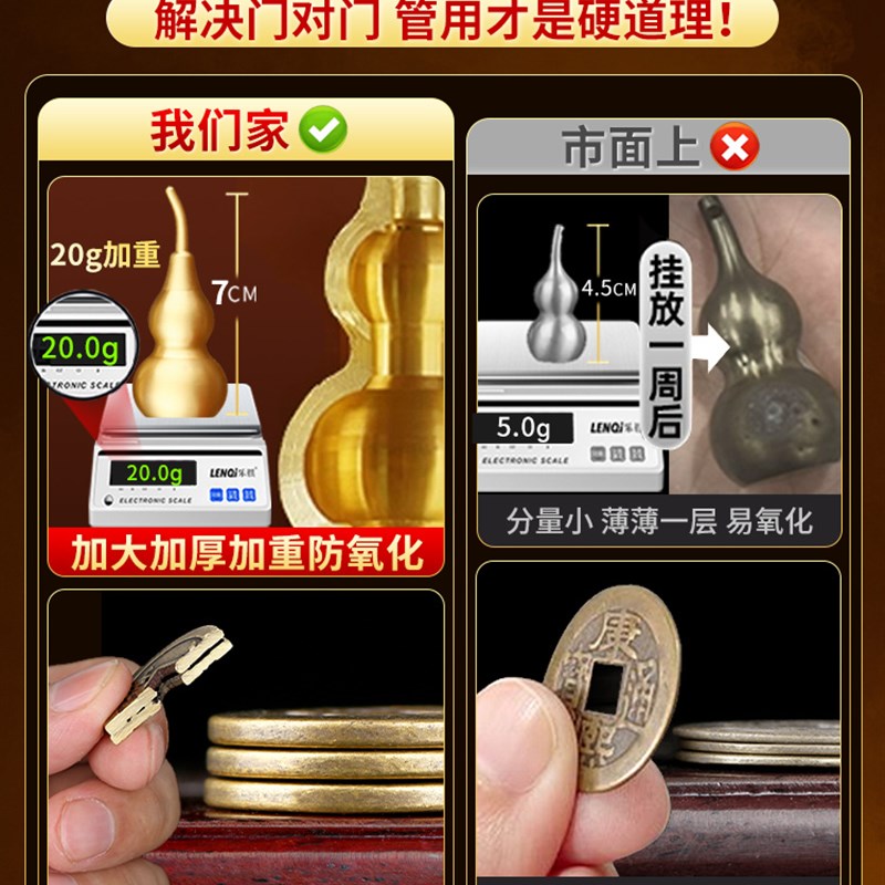 五帝钱挂件门对门黄铜葫芦开口朱砂天然纯胡真品压门槛全加厚古币