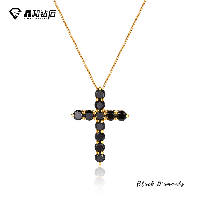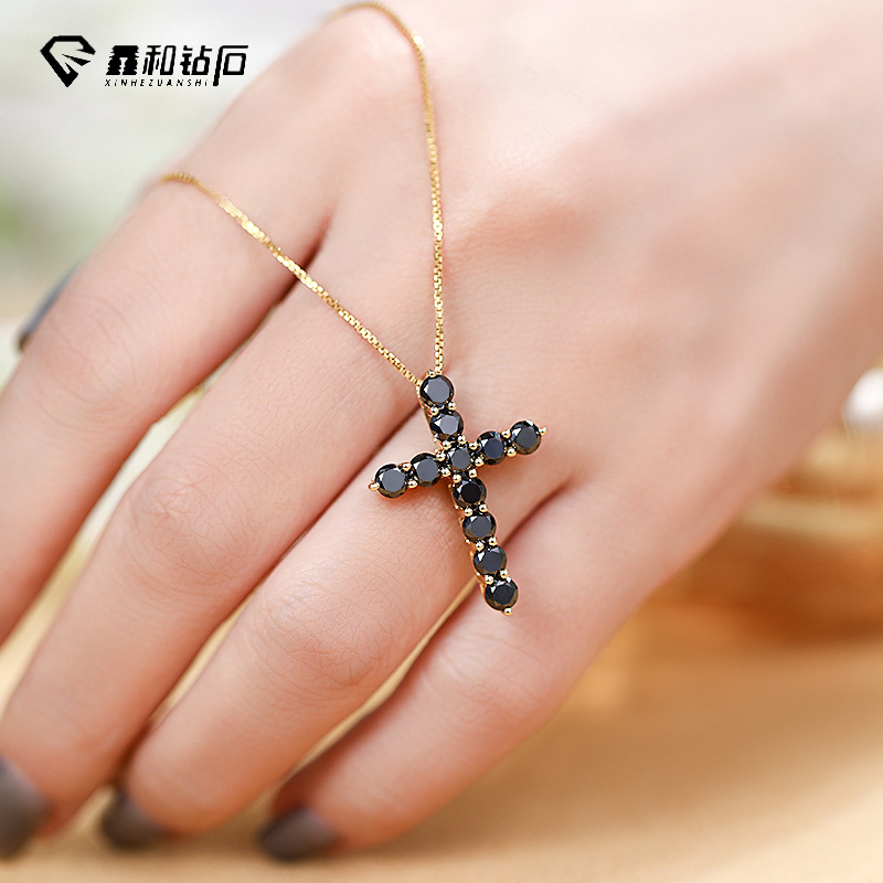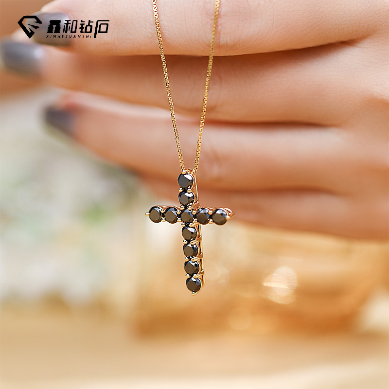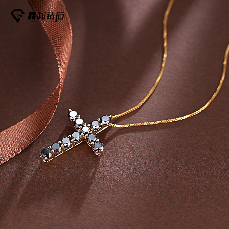 鑫和钻石18K黄金黑钻十字架吊坠时尚潮流个性天然黑钻百搭项链