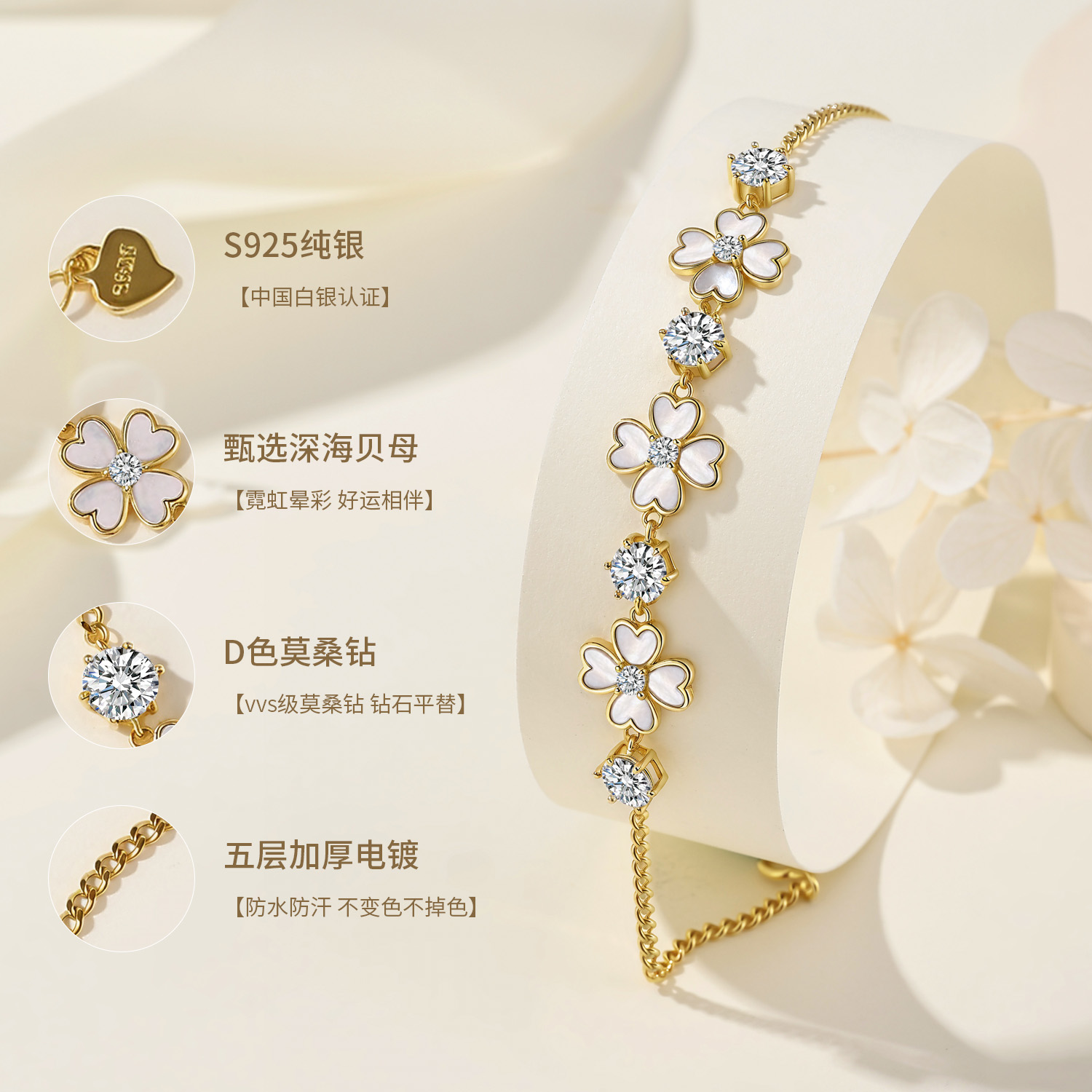 贝母莫桑钻四叶草手链手链女 纯银镀18k金色首饰品生日情人节礼物