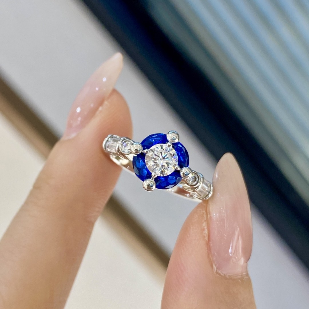 星球元素20分克莱因蓝钻戒|红宝石花瓣珠珠戒指女925银复古时尚