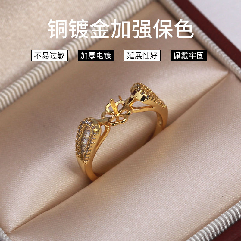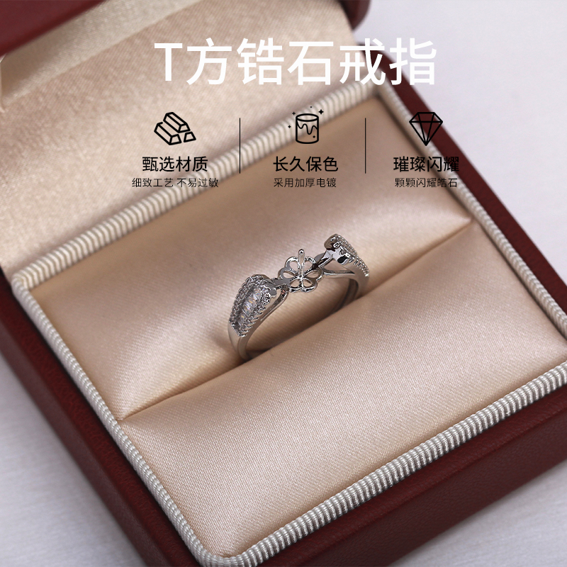 DIY珍珠配件新款铜镀金精致镶锆T方锆石戒指空托精美百搭