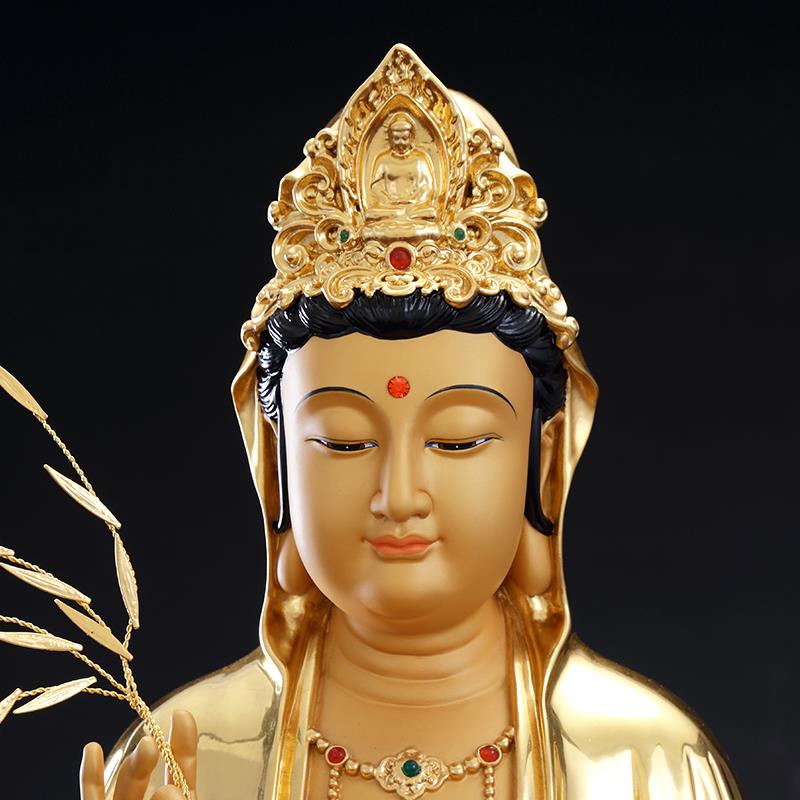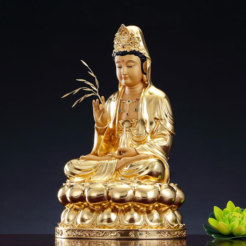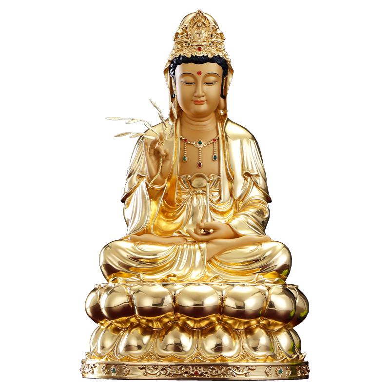 纯铜贴金观音菩萨家用供奉观音佛像南海坐莲观音铜像娑婆三圣摆件