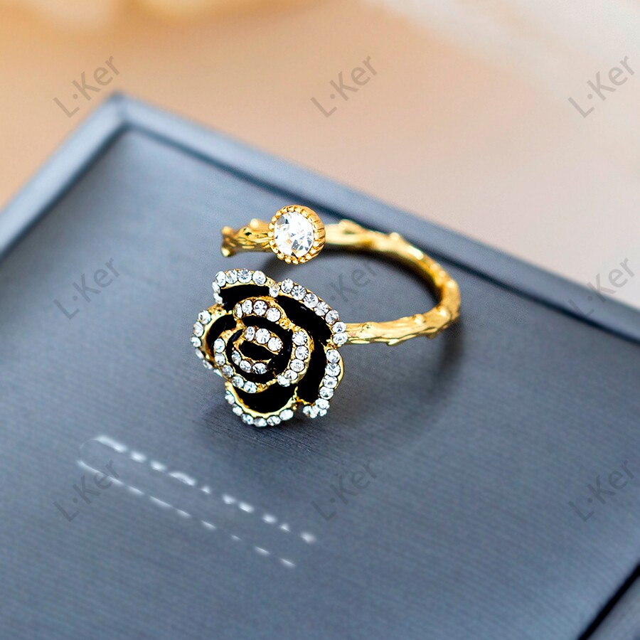 [玫瑰恋人] 2025法式满钻黑色玫瑰花戒指女士时尚感气质饰品J001