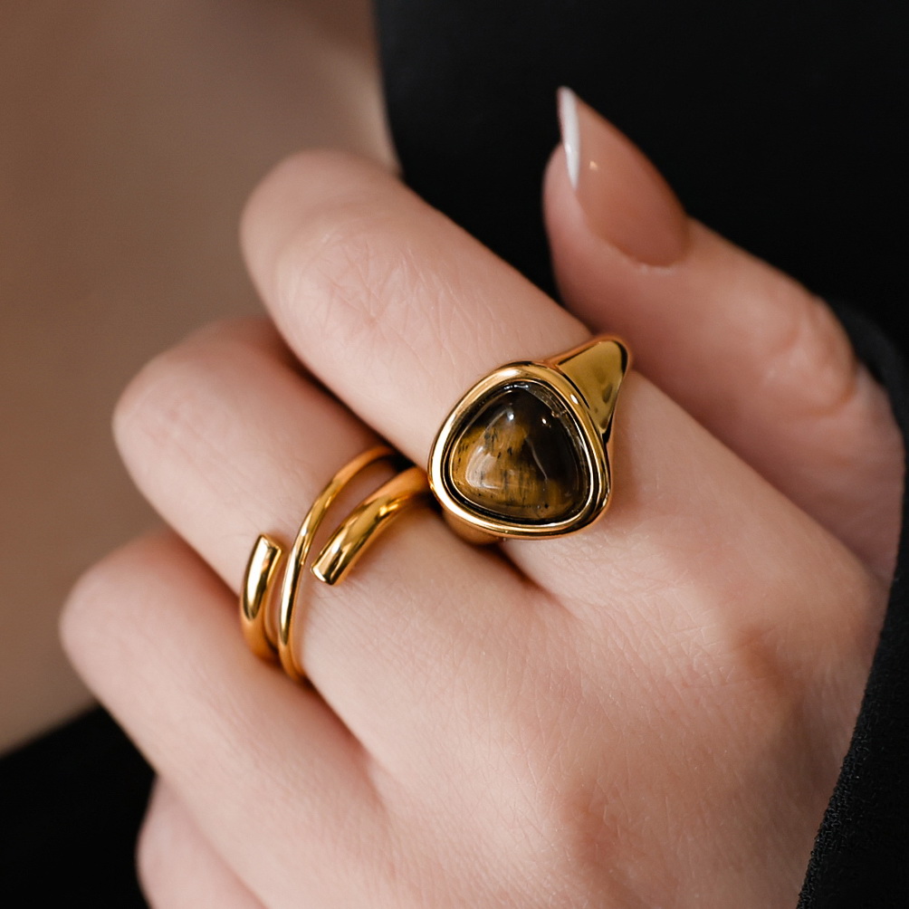 不掉色~复古高级感天然虎眼石金色戒指女不掉色食指中指指环叠戴