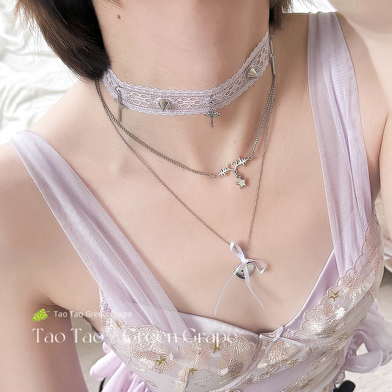 芭蕾少女~白色蕾丝十字架choke爱心项链女夏天多层叠戴颈链锁骨链